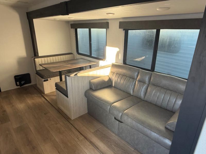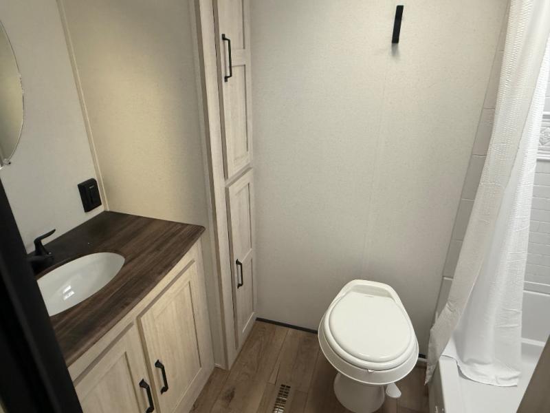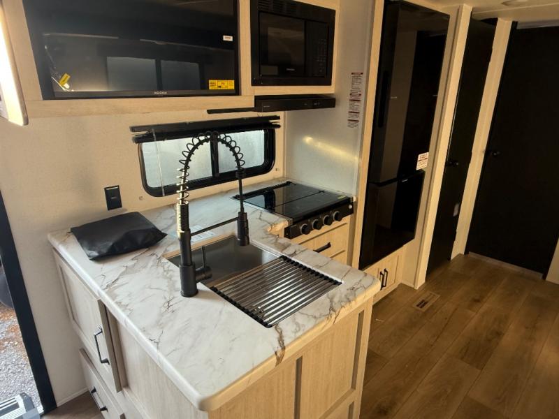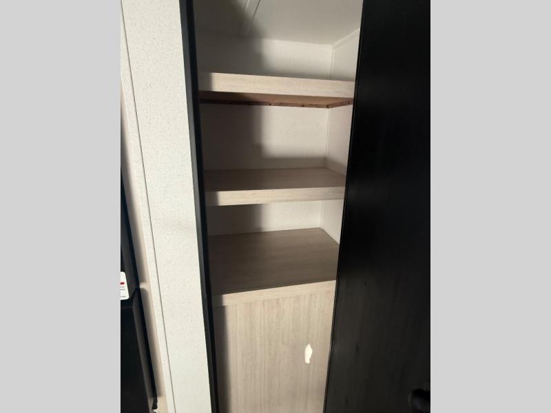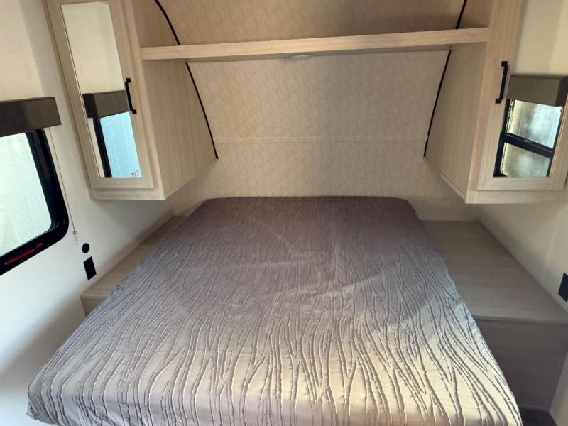Wherever you decide to camp, you can be sure to have a great time in this rear bath travel trailer! The combined kitchen and living area is made spacious thanks to the large slide out. Here, you can relax on the sofa and dine at the booth dinette, and an optional TV can be added if you want the option for movie night. The full kitchen will allow you to make meals each day, and you can choose to add the optional outside mini kitchen with a griddle if you want to cook with fresh air. This unit also includes a front private bedroom, complete with an RV queen bed, an overhead shelf and dual shirt closets to keep clothes wrinkle-free.