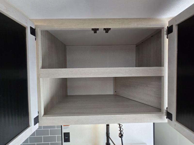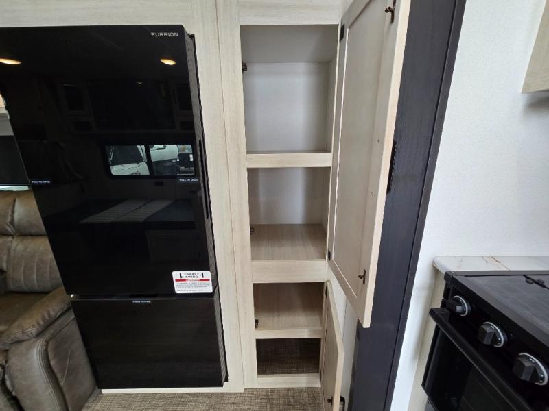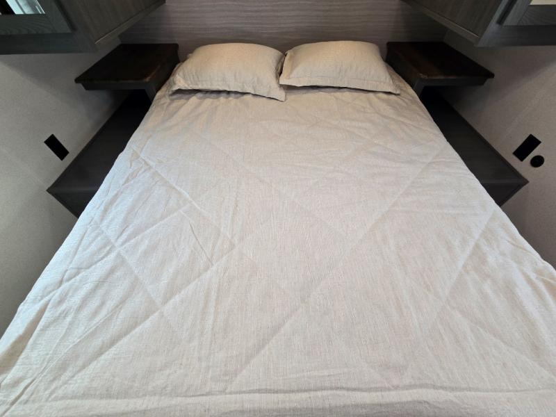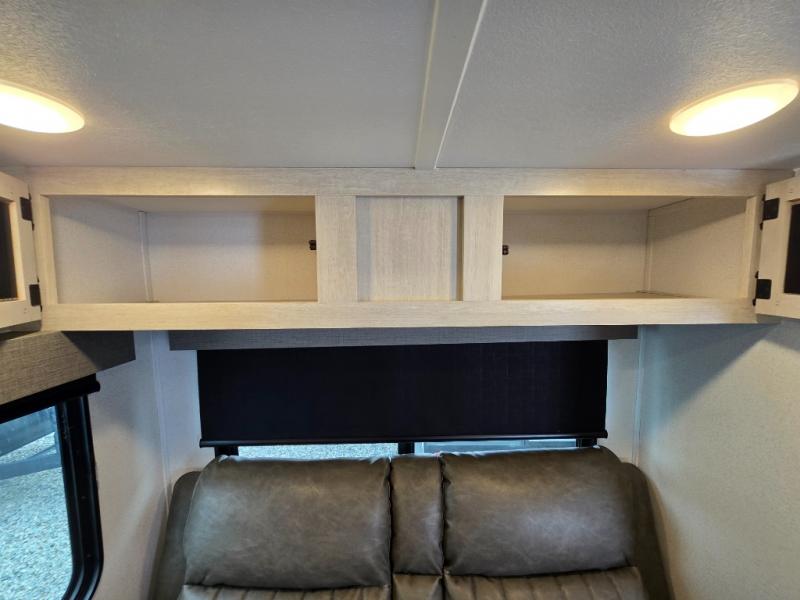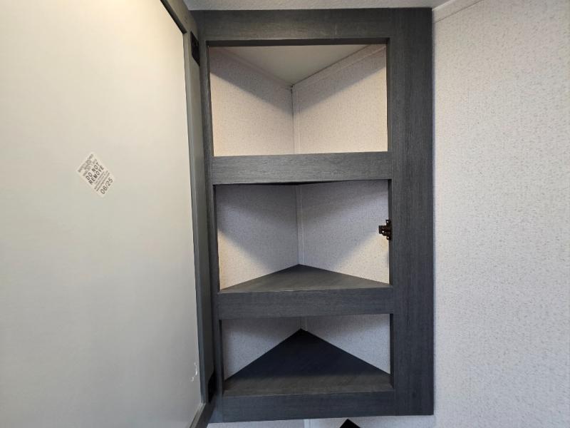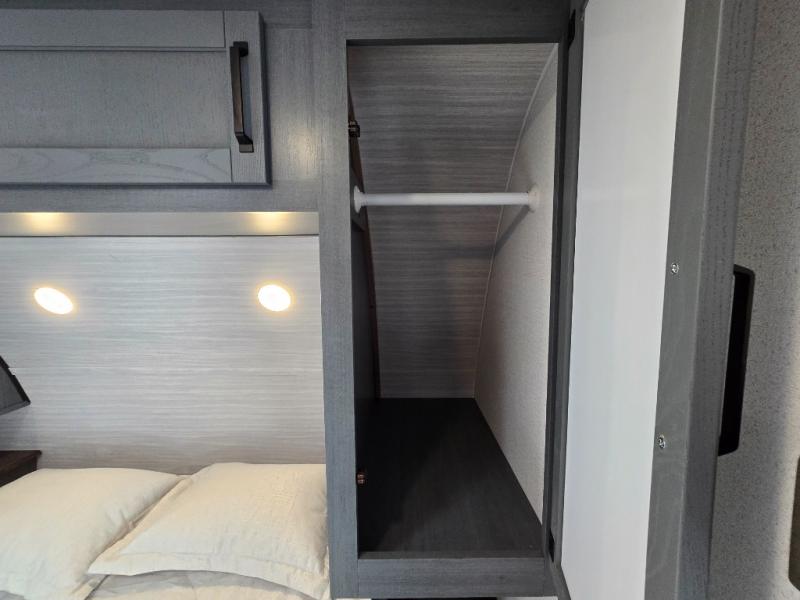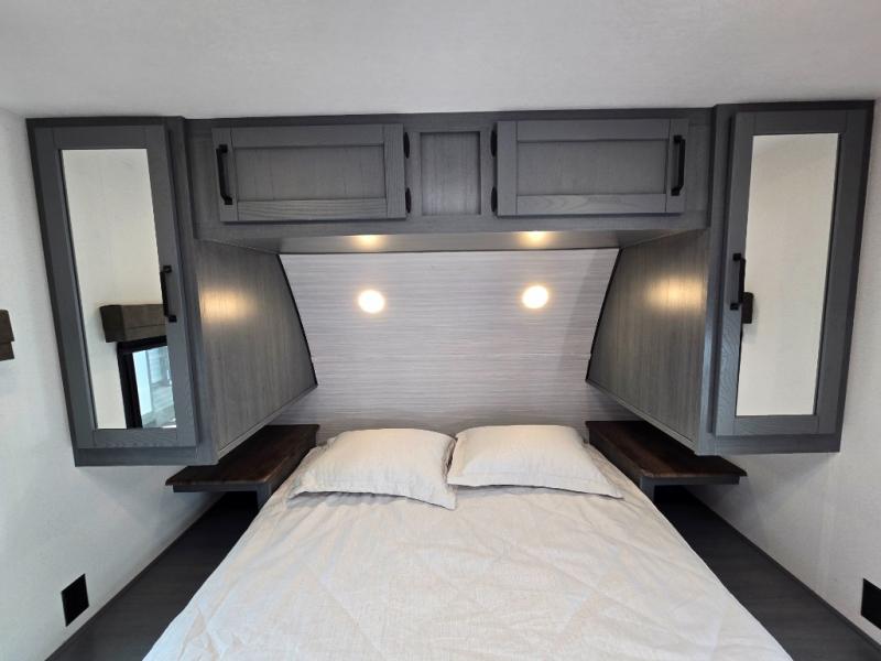 - Queen Bed: The front private bedroom includes a 60" x 74" RV queen bed with shirt closets on both sides and an overhead shelf, offering ample storage and a comfortable sleeping space.