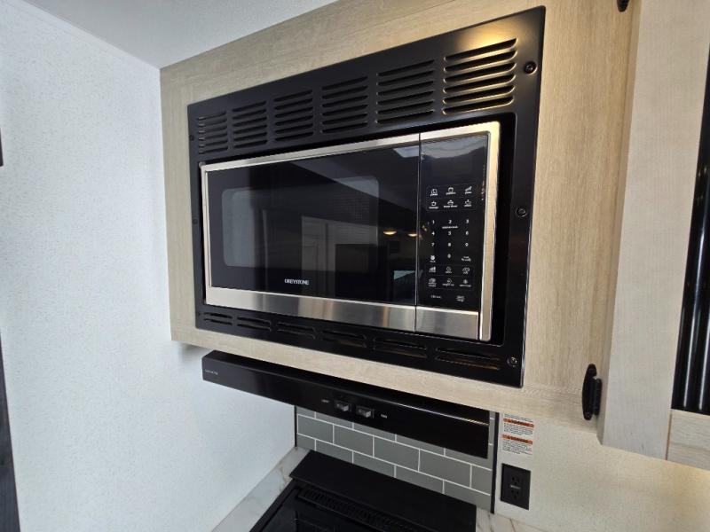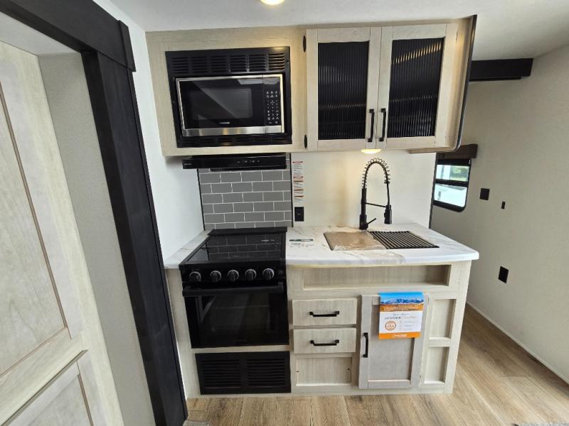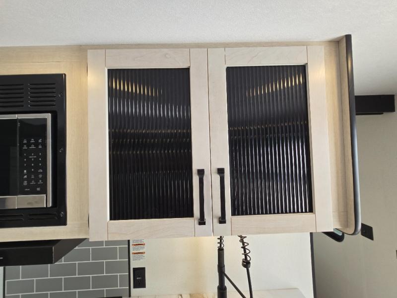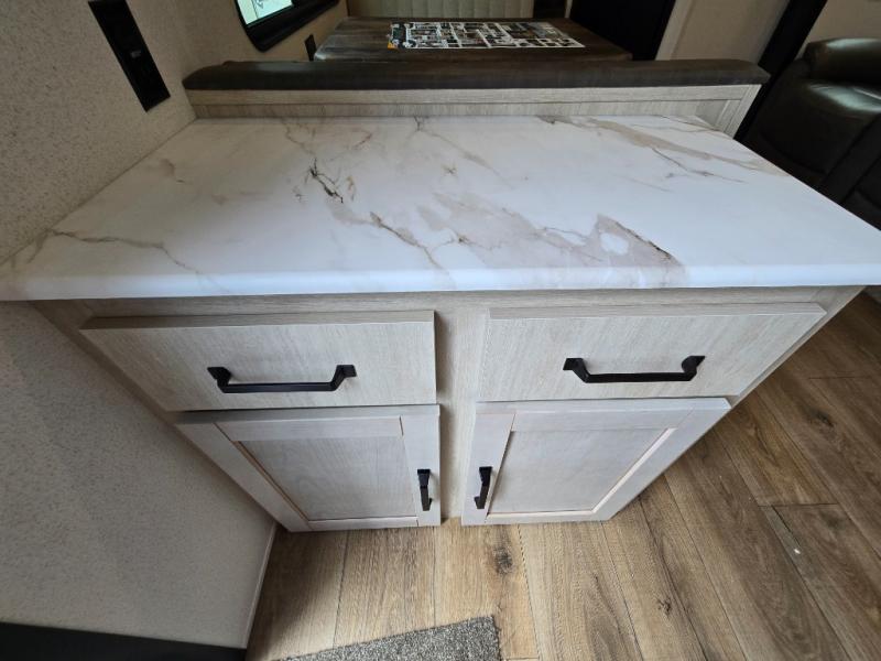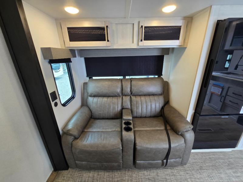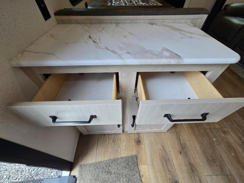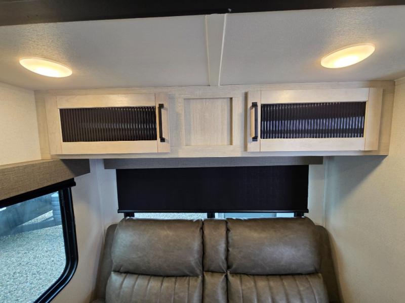 - Queen Bed: The front private bedroom includes a 60" x 74" RV queen bed with shirt closets on both sides and an overhead shelf, offering ample storage and a comfortable sleeping space.