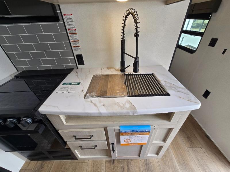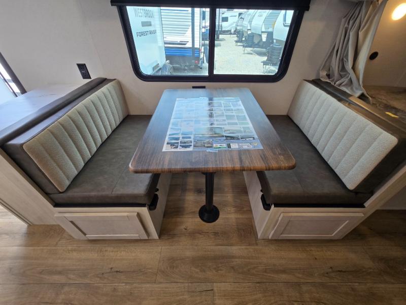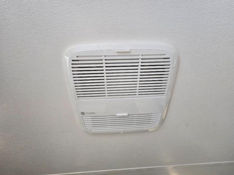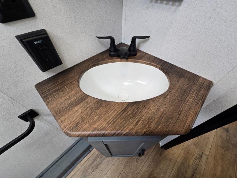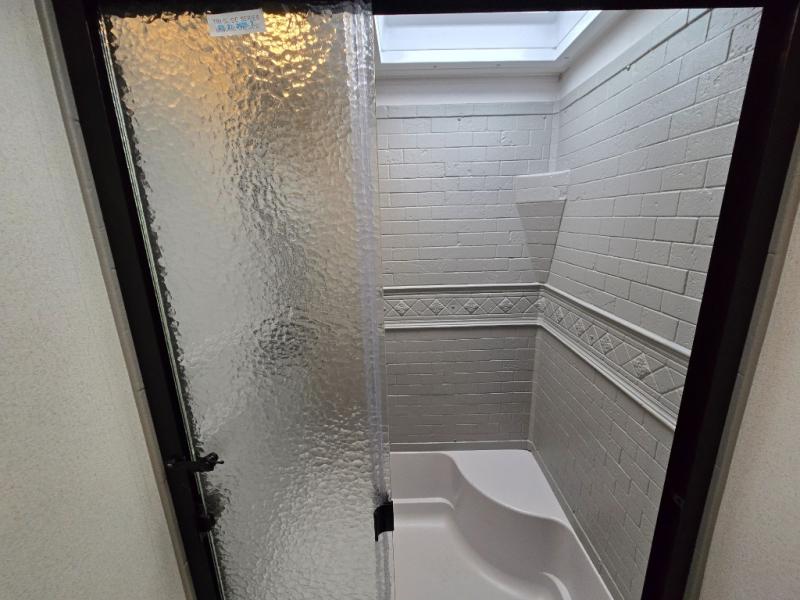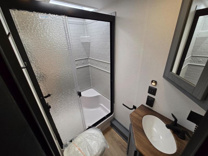 - Rear Corner Bathroom: The bathroom includes a spacious 32" x 40" shower with a seat, providing comfort and convenience while traveling.