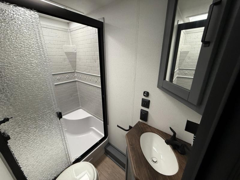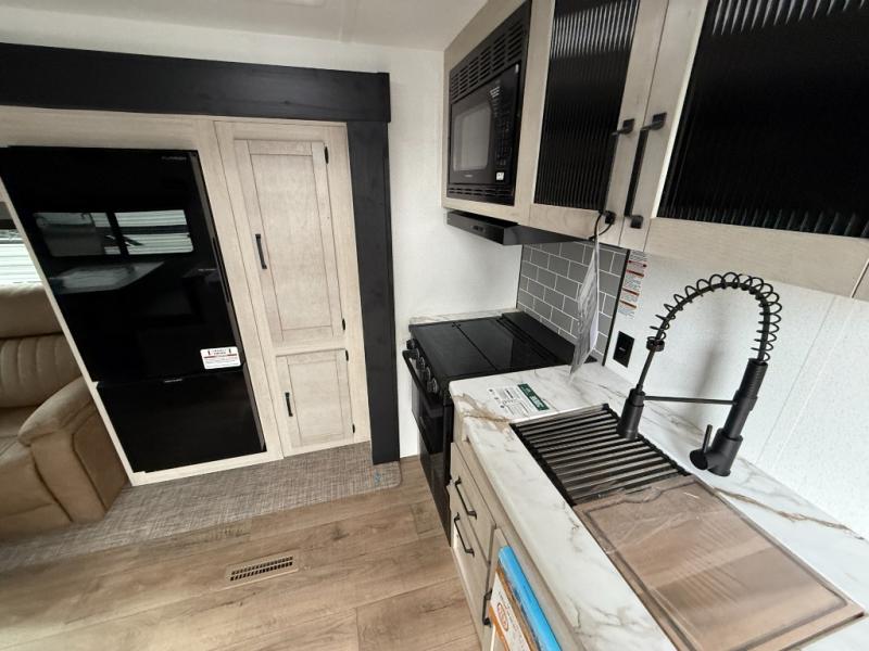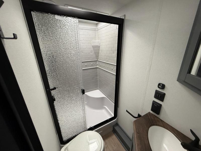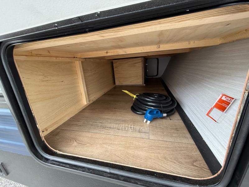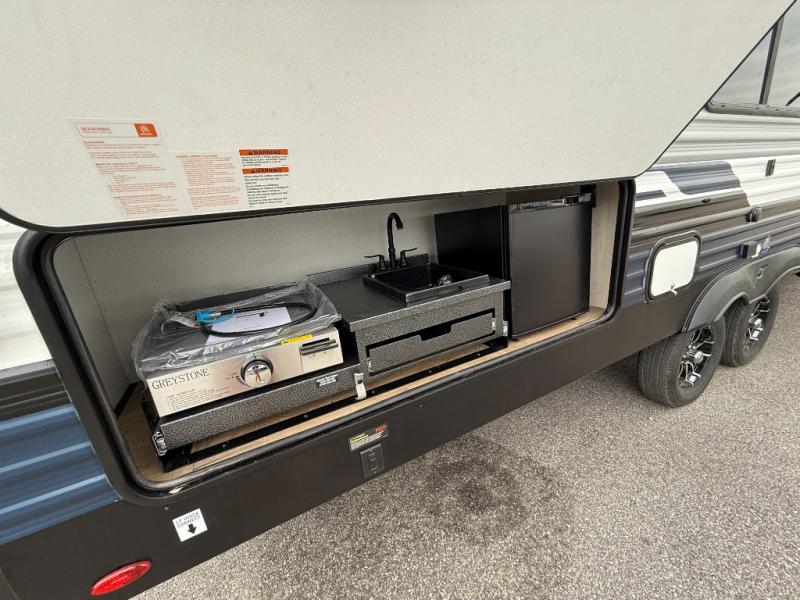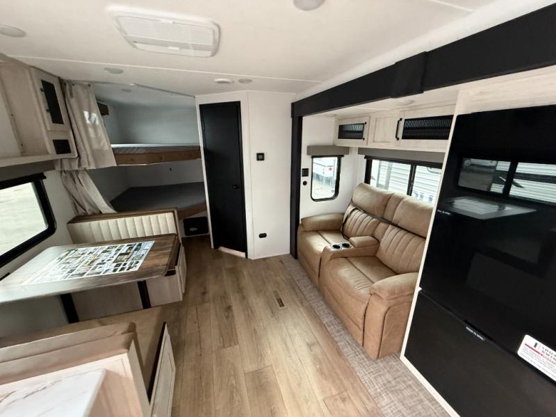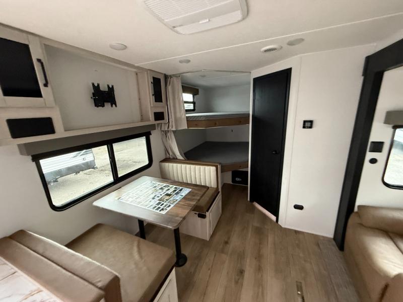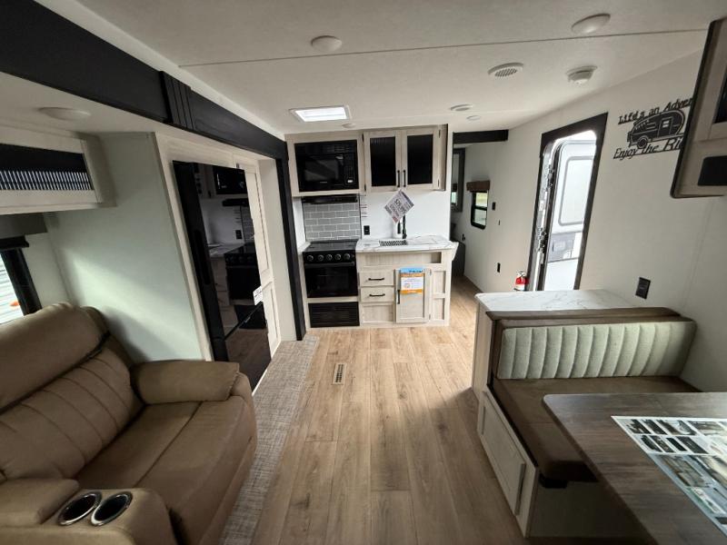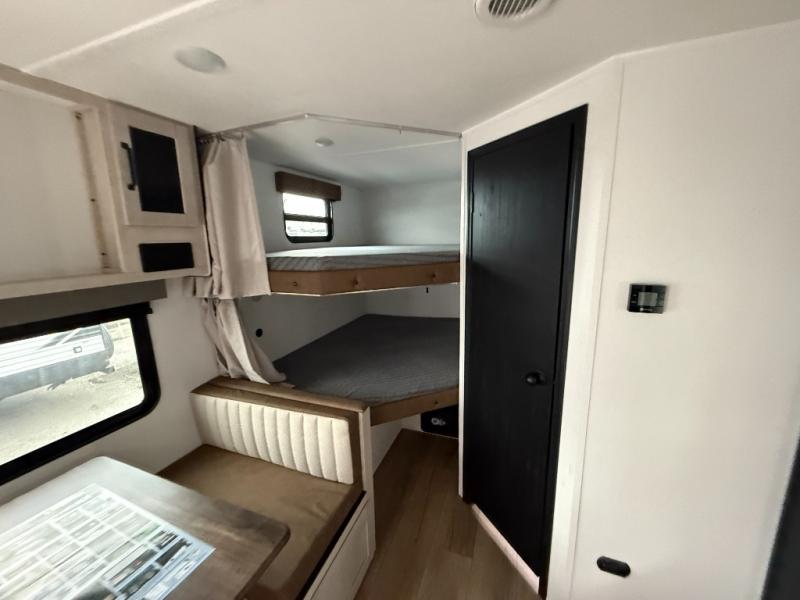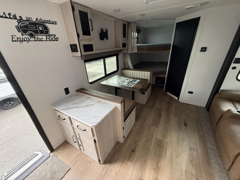 There's room for the whole family in this travel trailer! You will enjoy your own privacy with the front private bedroom which features a 60" x 80" queen bed with shirt closets on either side to hang your clothes, and a shelf above for your books or alarm clock. The kiddos can sleep on the set of 48" x 76" double-size bunk beds. They can even invite a friend or two to join in on the fun and sleep on either the sofa or booth dinette once converted. Everyone can freshen up in the rear corner bathroom with a 32" x 40" shower with a seat, and keep their bellies full with the stainless steel oven and range. You could even choose to add the optional outside mini kitchen if you enjoy cooking outdoors!