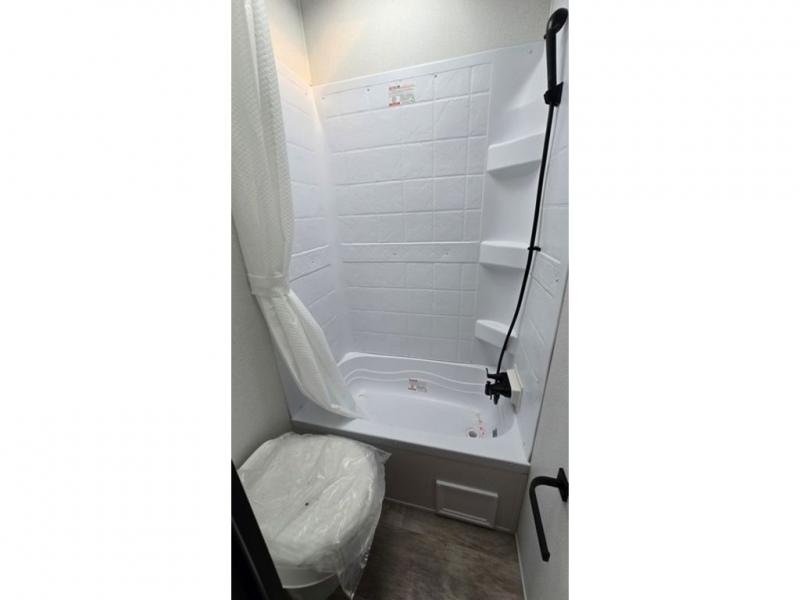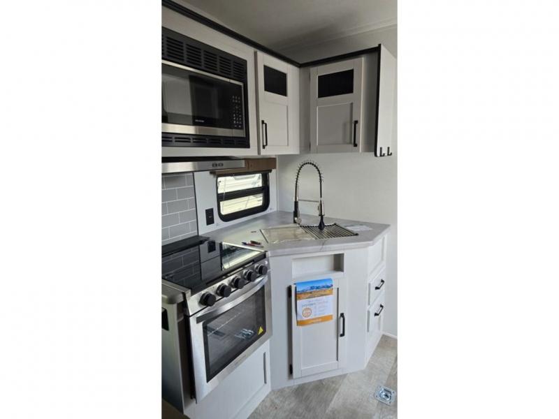 Pack your bags, grab your helmet, and load up the dirt bikes in this toy hauler for four! There is 11' of cargo space for your toys plus two flip-up sleeper sofas with a dinette for seating and sleeping space. If you have even more guests, just choose the optional queen bed electric lift. The kitchen on this unit includes everything you need to prepare meals each day, including a 21" oven, a convection microwave with an air fryer, plus an 11-cu. ft. 12V refrigerator. You might even like to choose the optional outside kitchen with a griddle for breakfast outdoors! The full bath includes a private shower and toilet, with the sink right across the hall so two people can freshen up before bed, and the front bedroom is sure to bring comfort with its RV queen bed, wardrobe, and bedroom shelf for your things!