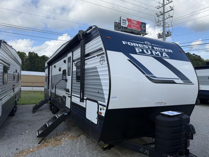 Each Puma Ambush toy hauler travel trailer by Forest River is constructed with a durable tub surround, super lube axles for smooth towing, and a rugged front diamond plate. You will enjoy premium amenities, including a plush bedspread and pillows, LED lighting, and a bath skylight. Cook like a five-star chef with the 21" oven and range hood and indulge in entertainment with the AM/FM/Bluetooth stereo and outside speakers. Plus, you will love the convenient night roller shades, the outside shower ideal for outdoor enthusiasts, and so much more! Whether hauling motorcycles, ATVs, or gear for your next outdoor escapade, these toy hauler travel trailers are your ultimate adventure companion.
