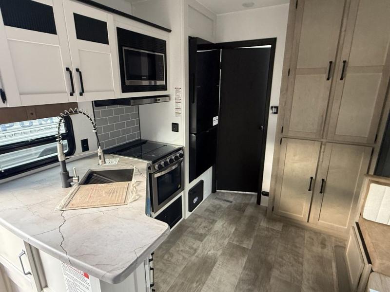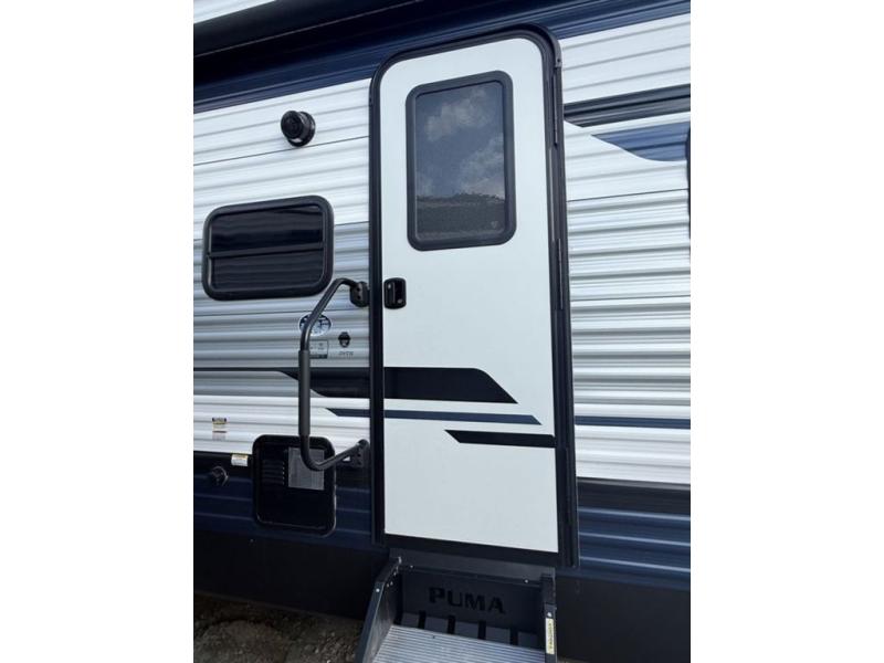 The most spacious toy hauler travel trailer in the Puma Ambush lineup, this unit is ready for adventure when you are! There are dual entry doors, one of which leads to the 13' separate garage. Here, you'll find 62" rollover sofas, an optional queen bed electric lift, plus a 7' 3" ramp door with spring assist for easy unloading. The walk-through bath will be easily accessible for everyone to use, and the main living room is shared with the kitchen so everyone can gather together when dinner is being made. A 21" oven comes standard in the kitchen, along with a stainless-steel convection microwave with an air fryer and an 11-cu. ft. 12V black glass residential style refrigerator. When you're ready for bed, the front private bedroom with an RV queen bed will provide a great night's rest, and there are dual shirt closets to keep your clothes wrinkle-free.