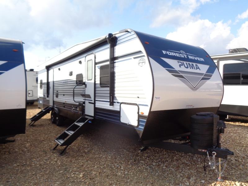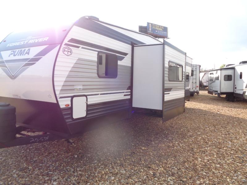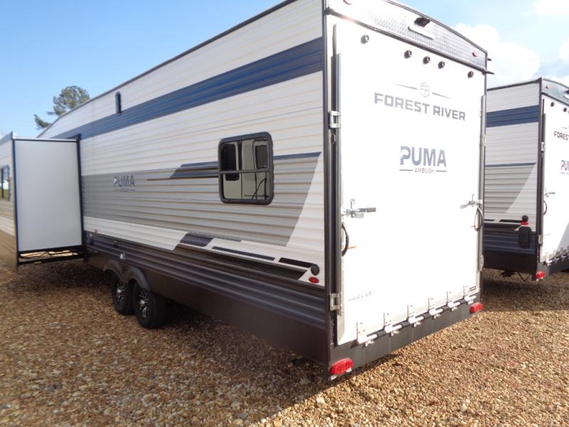 Each Puma Ambush toy hauler travel trailer by Forest River is constructed with a durable tub surround, super lube axles for smooth towing, and a rugged front diamond plate. You will enjoy premium amenities, including a plush bedspread and pillows, LED lighting, and a bath skylight. Cook like a five-star chef with the 21" oven and range hood and indulge in entertainment with the AM/FM/Bluetooth stereo and outside speakers. Plus, you will love the convenient night roller shades, the outside shower ideal for outdoor enthusiasts, and so much more! Whether hauling motorcycles, ATVs, or gear for your next outdoor escapade, these toy hauler travel trailers are your ultimate adventure companion.