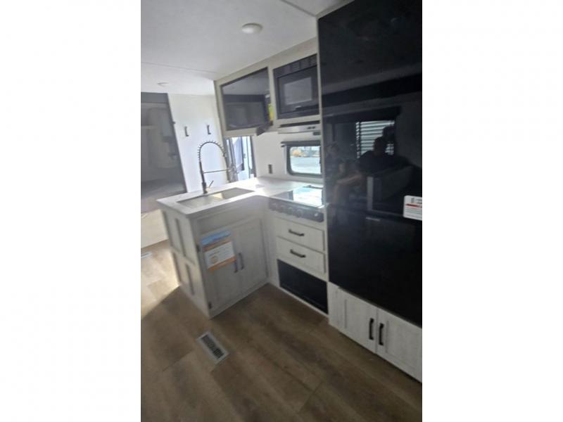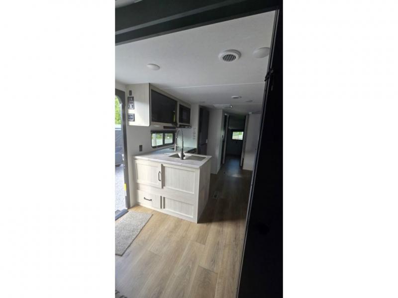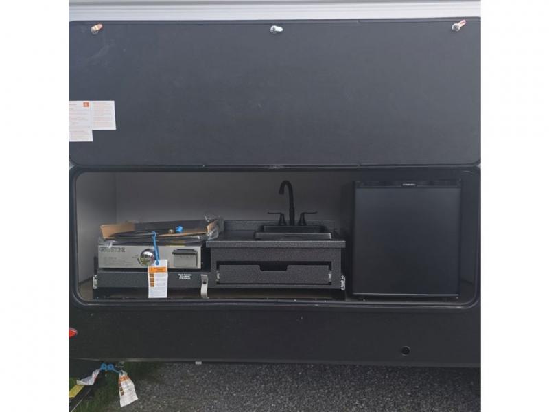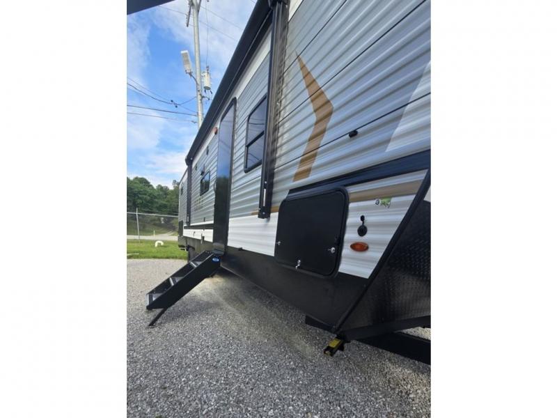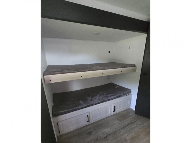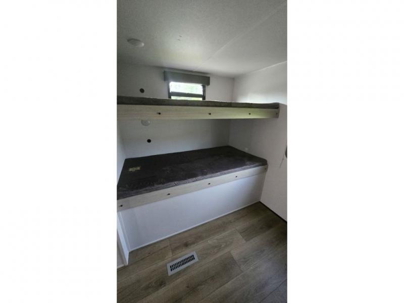 If you're looking for more space, this double axle, double slide out unit is perfect for your group of eight. Within the large slide in the living room, you'll find the booth dinette and sofa, which sit across from the optional TV if you want to enjoy movie nights. The full kitchen includes a microwave and three burner cooktop to make meals, plus a pantry and 12V refrigerator for food storage. And an optional outside mini kitchen with a grill can be added if you enjoy cooking outdoors! Your guests or littles are sure to enjoy the rear private bunkhouse that features a set of 38" x 76" bunks across from the third bunk and jiffy sofa within a slide out!