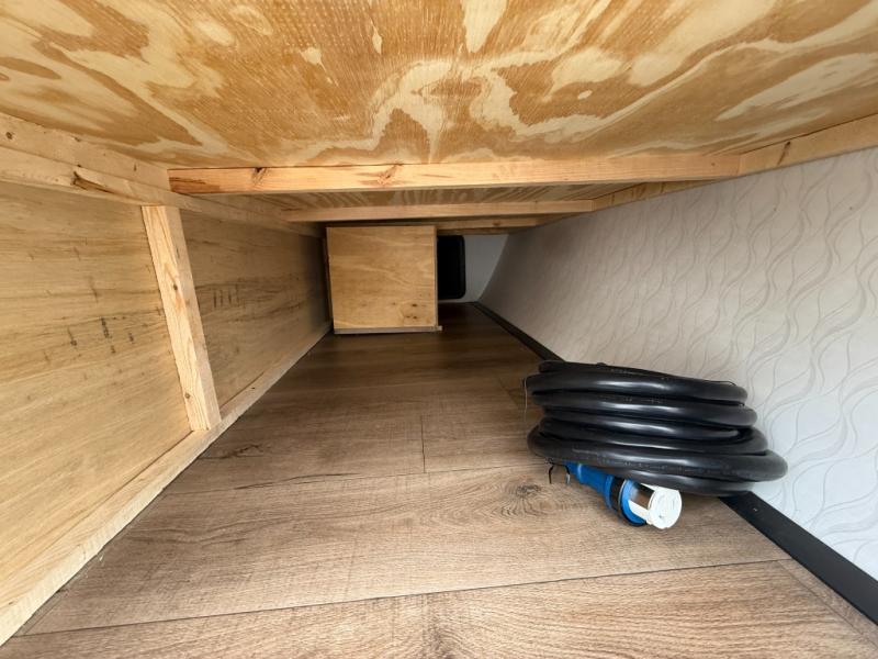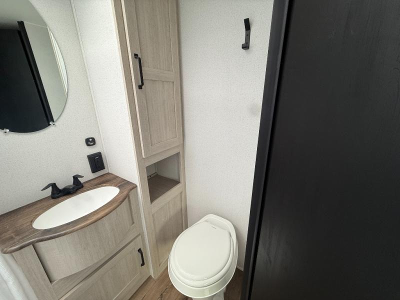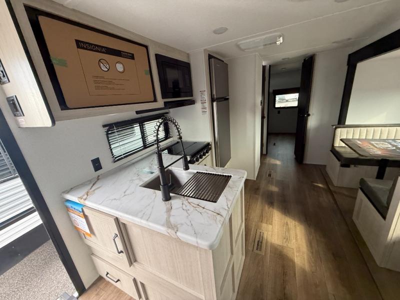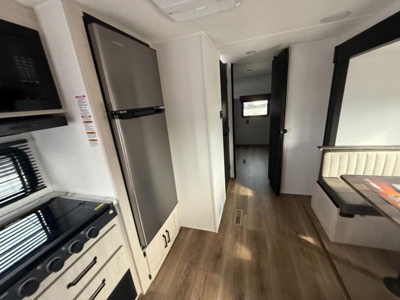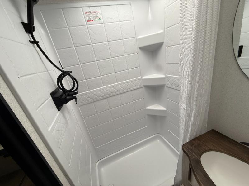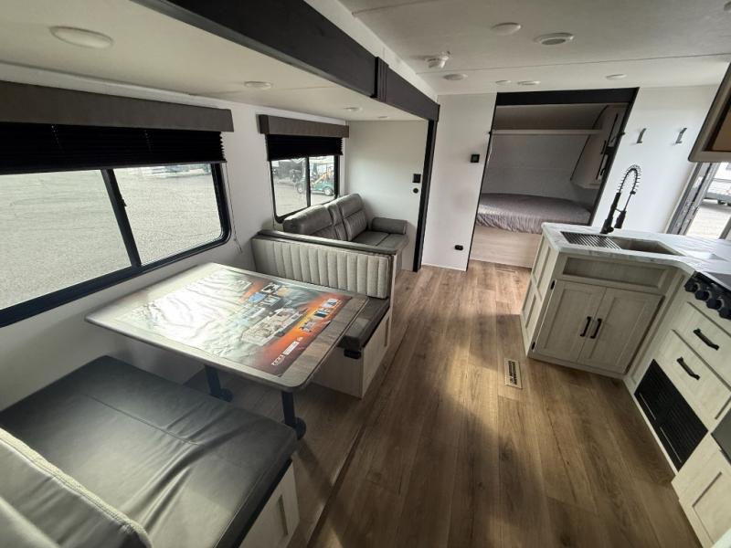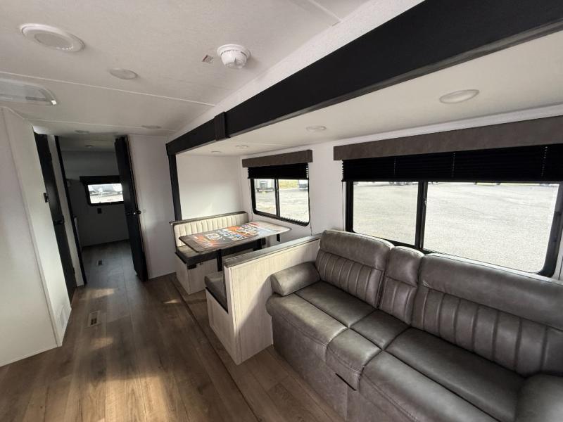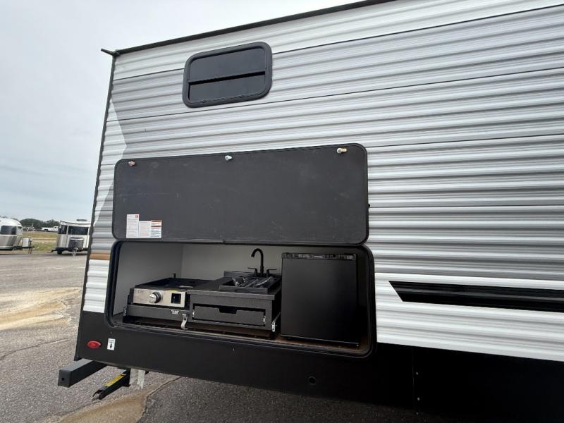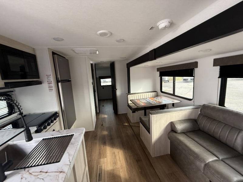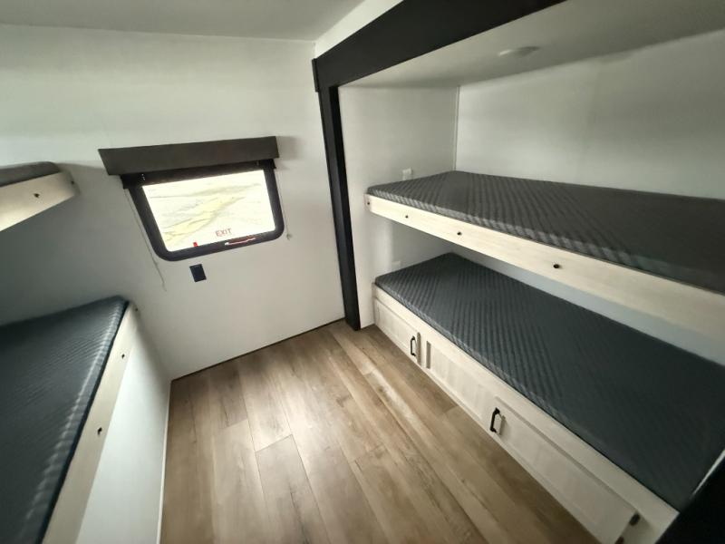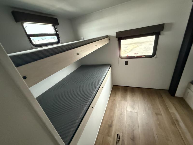 If you're looking for more space, this double axle, double slide out unit is perfect for your group of eight. Within the large slide in the living room, you'll find the booth dinette and sofa, which sit across from the optional TV if you want to enjoy movie nights. The full kitchen includes a stainless microwave and three burner cooktop to make meals, plus a pantry and 12V refrigerator for food storage. And an optional outside kitchen with a griddle can be added if you enjoy cooking outdoors! Your guests or littles are sure to enjoy the rear private bunkhouse that features a set of 38" x 76" bunks across from the third bunk and jiffy sofa within a slide out!