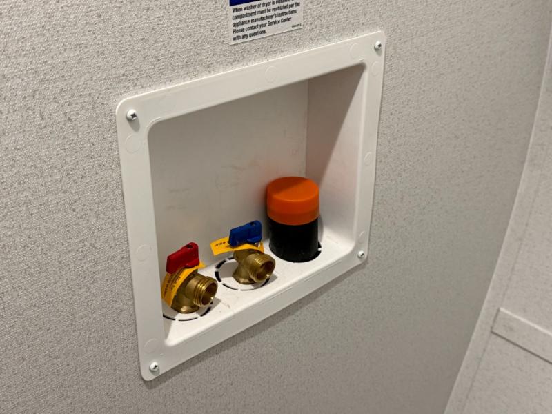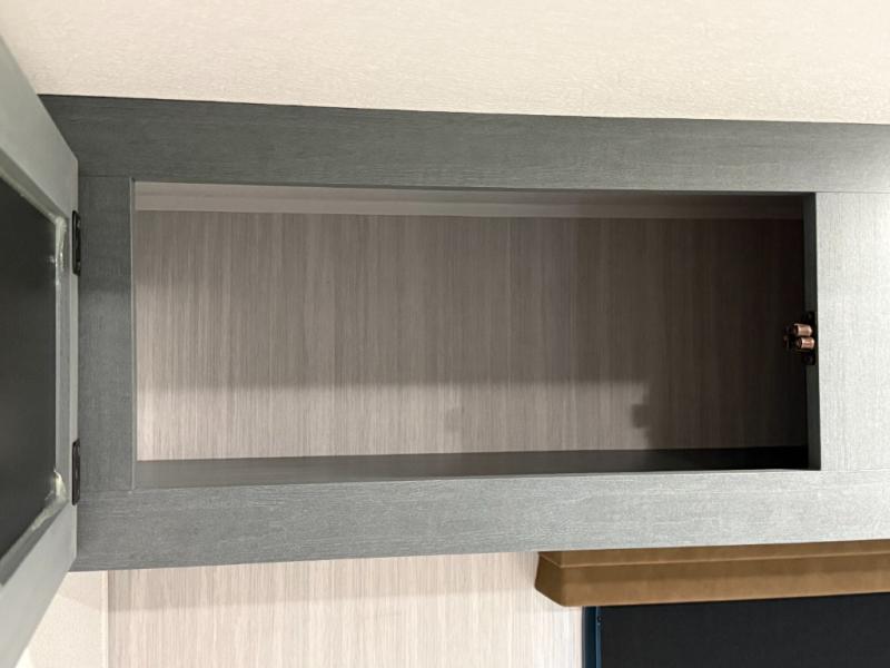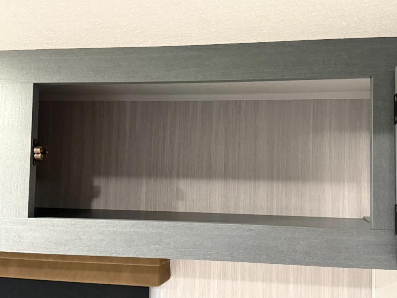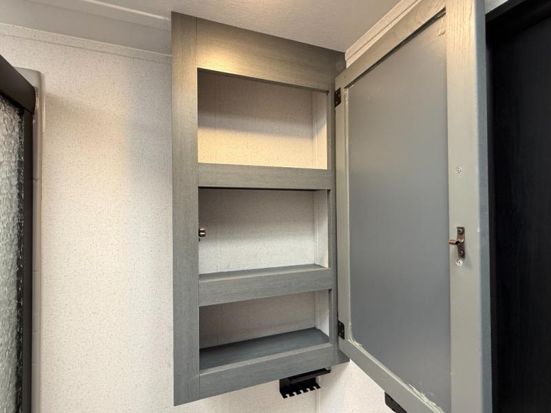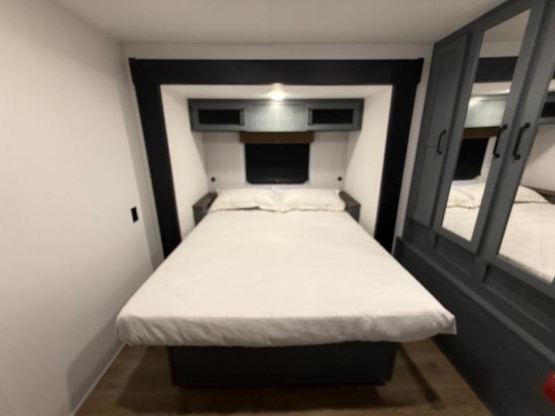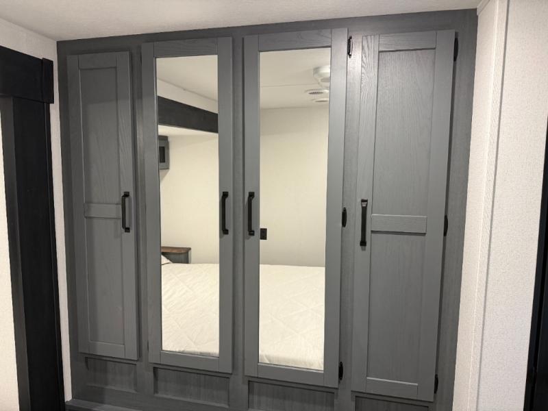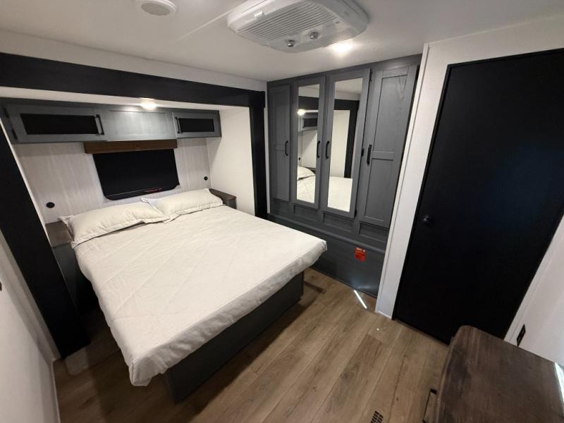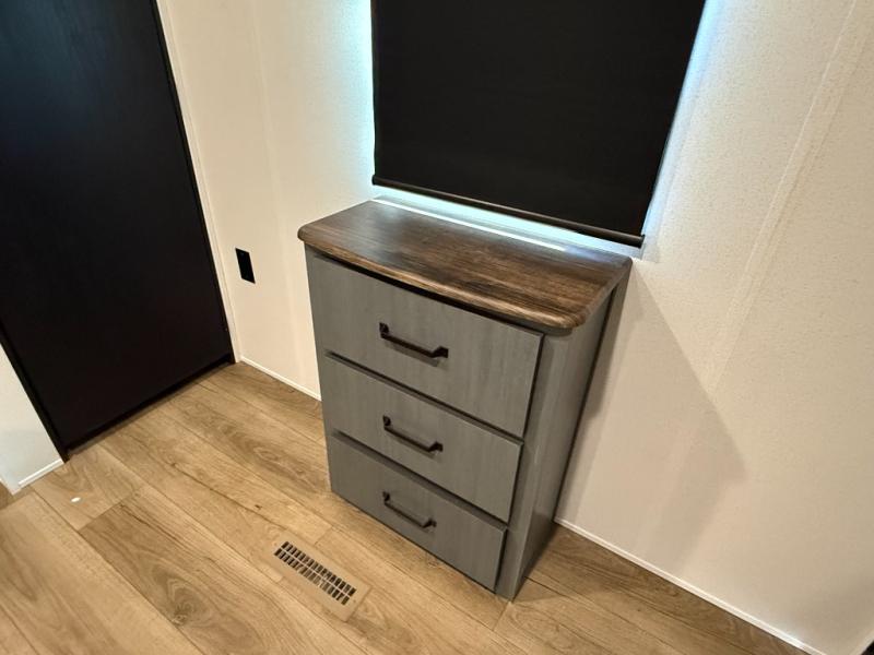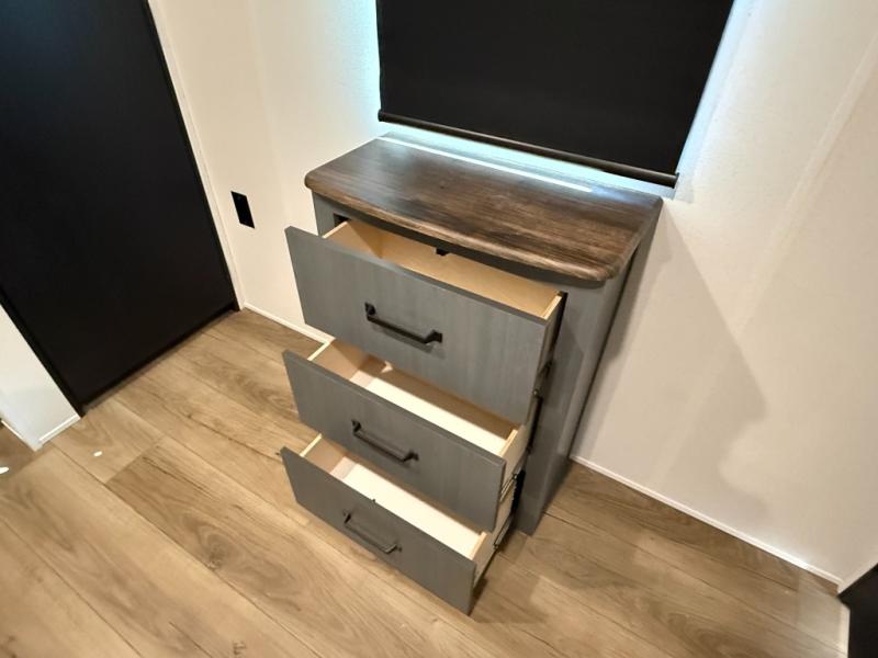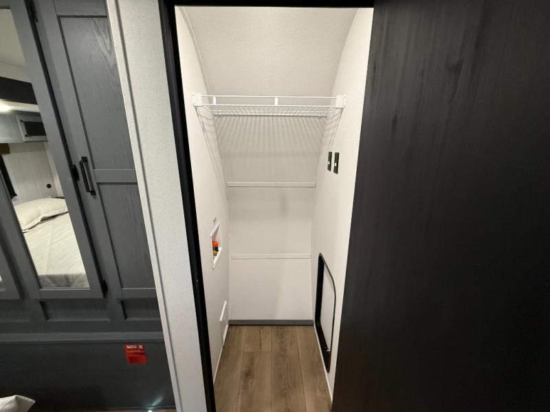 Front Private Bedroom: Features a queen bed slide-out, dresser, and a front closet with washer/dryer prep, offering convenience for extended stays.