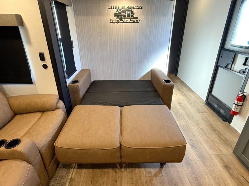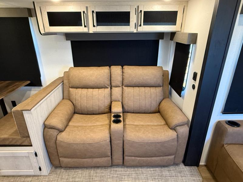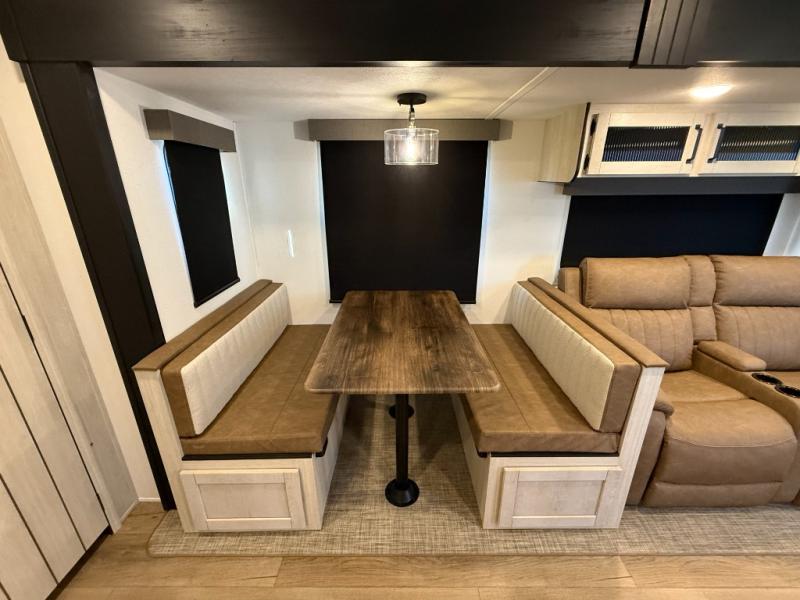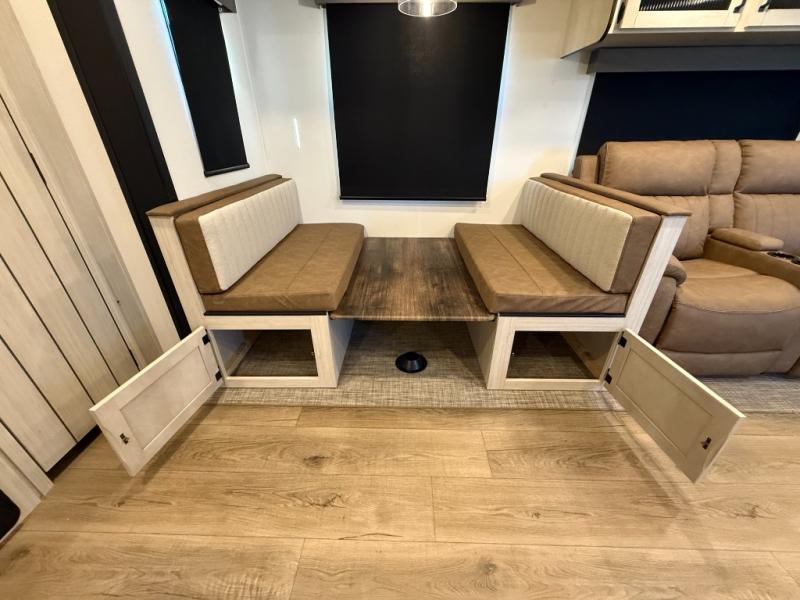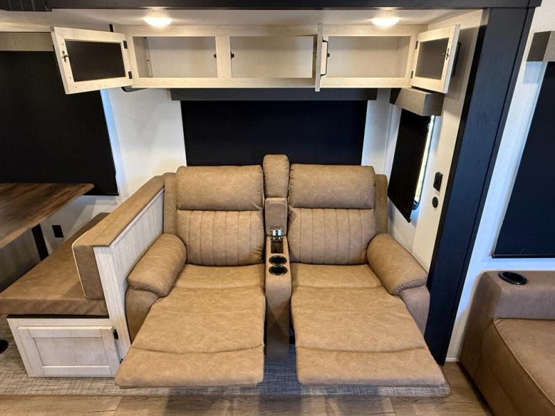 Living Area: Equipped with two recliners, a sofa, and a booth dinette, offering multiple seating options for relaxation and dining.