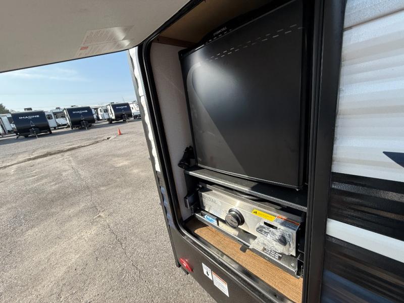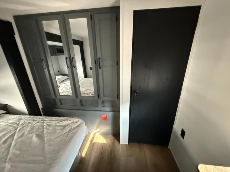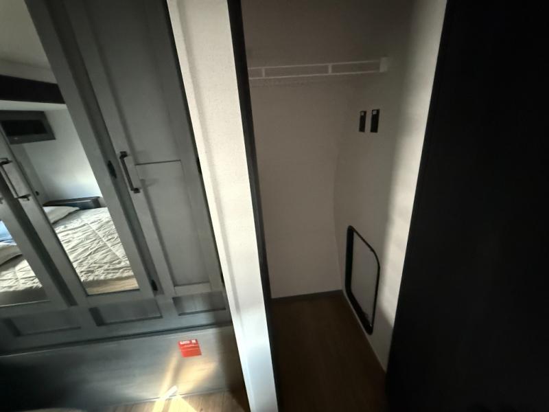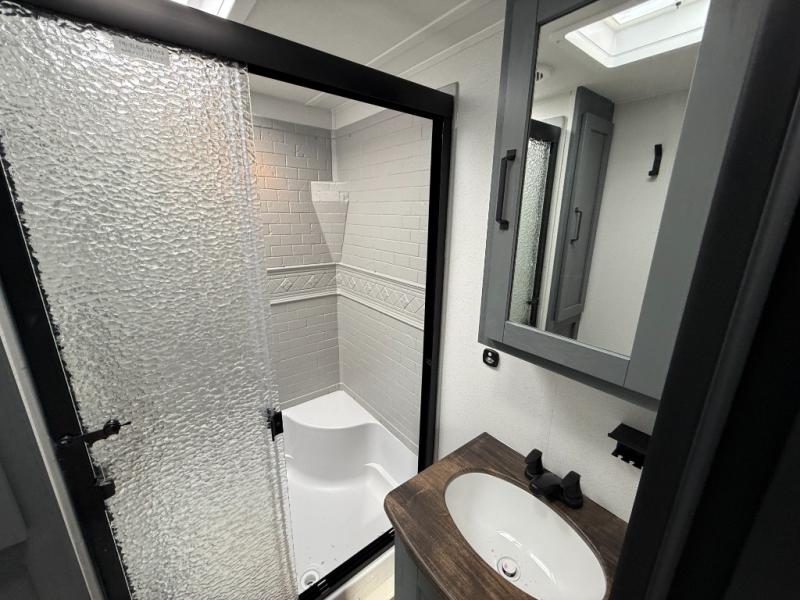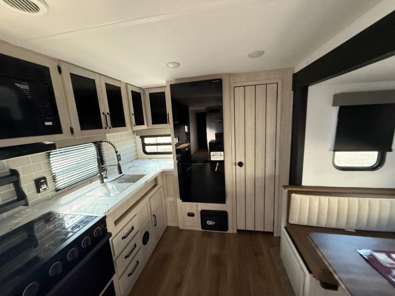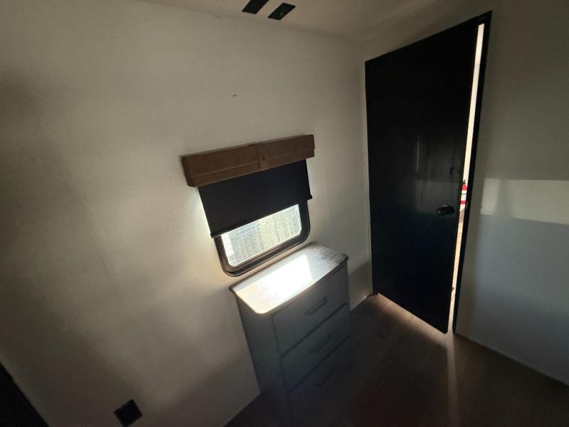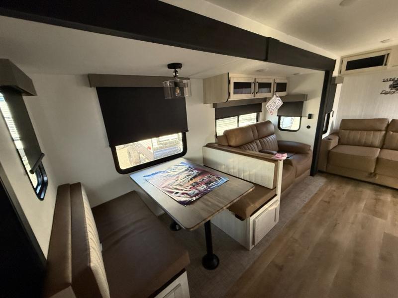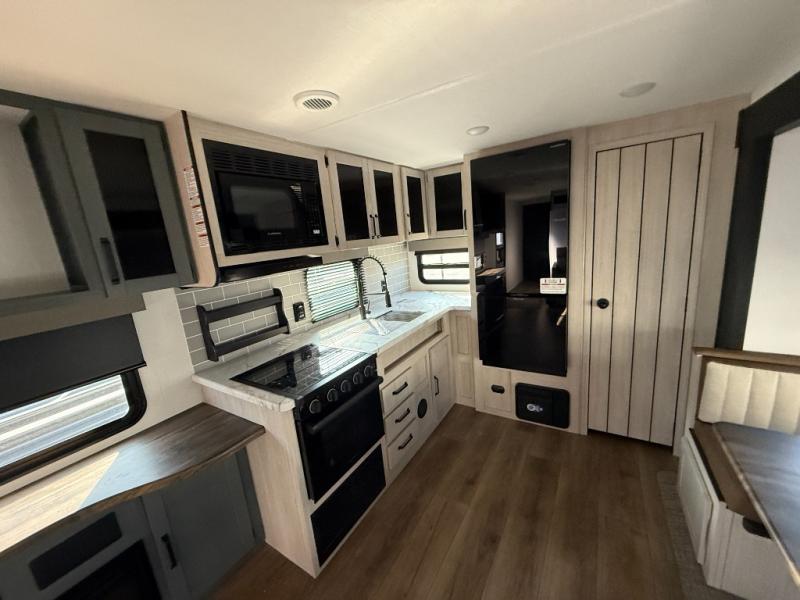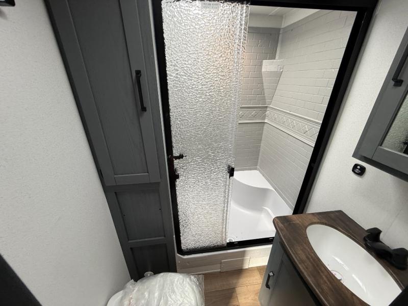 You won't want to camp any other way once you step inside this travel trailer! The rear kitchen has a stainless steel oven and range to prepare your best meals, a 12V refrigerator to keep your perishables fresh, and a walk-in pantry for your canned goods and snacks for movie night. After a fun day at the beach, you can play a card game at the booth dinette, relax in either one of the two recliners and sofa, or rinse the sand out of your hair in the 32" x 40" shower with a seat in the full bathroom. There is also a front private bedroom with a queen bed slide across from a dresser and a front closet with another closet with washer and dryer prep.
