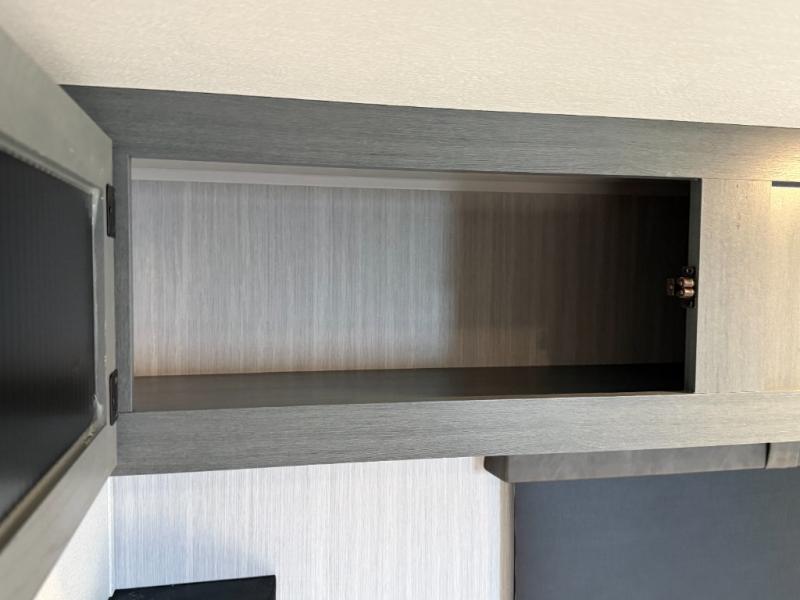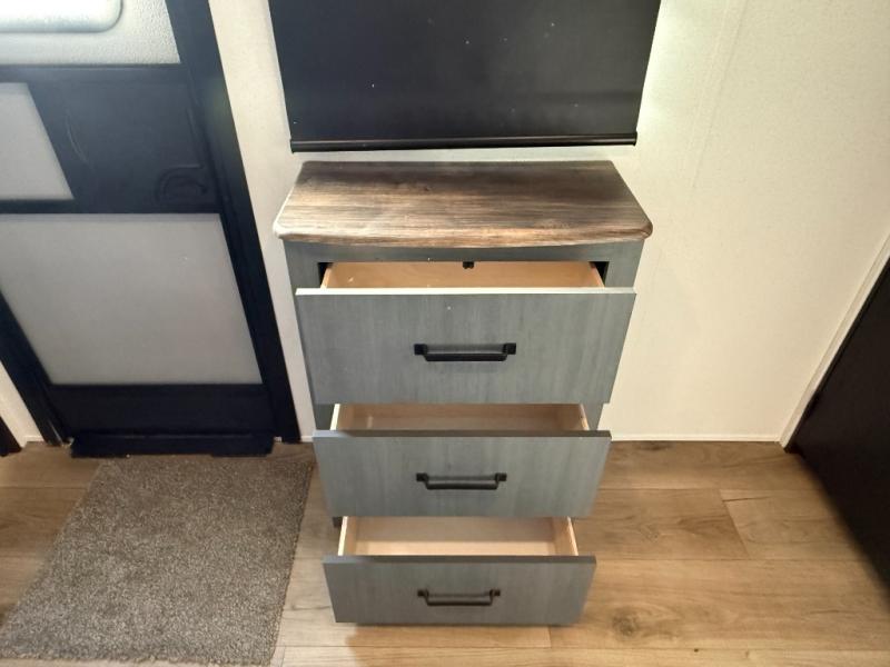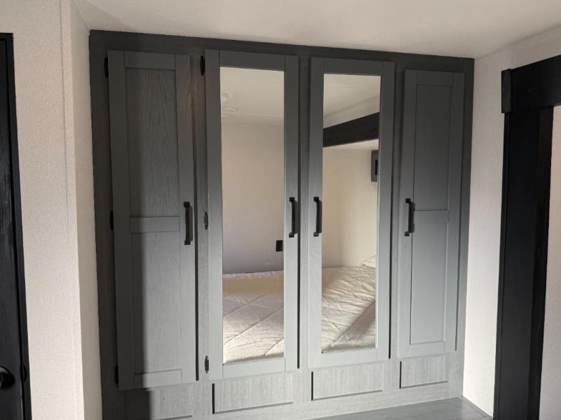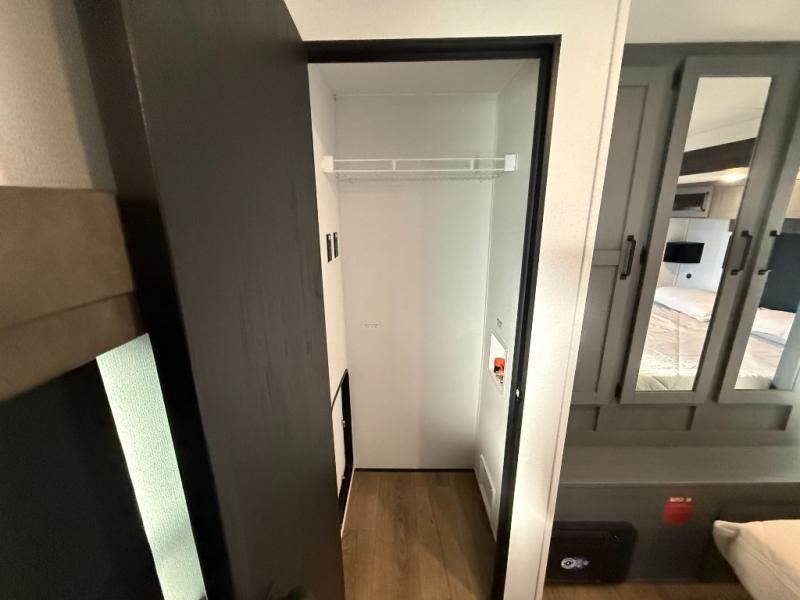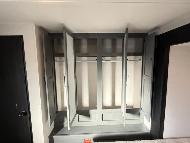 Bedrooms / Sleeping: Rear private bedroom with a king bed slide (72" x 80"). There is substantial wardrobe and dresser storage, and washer/dryer prep in the closet.