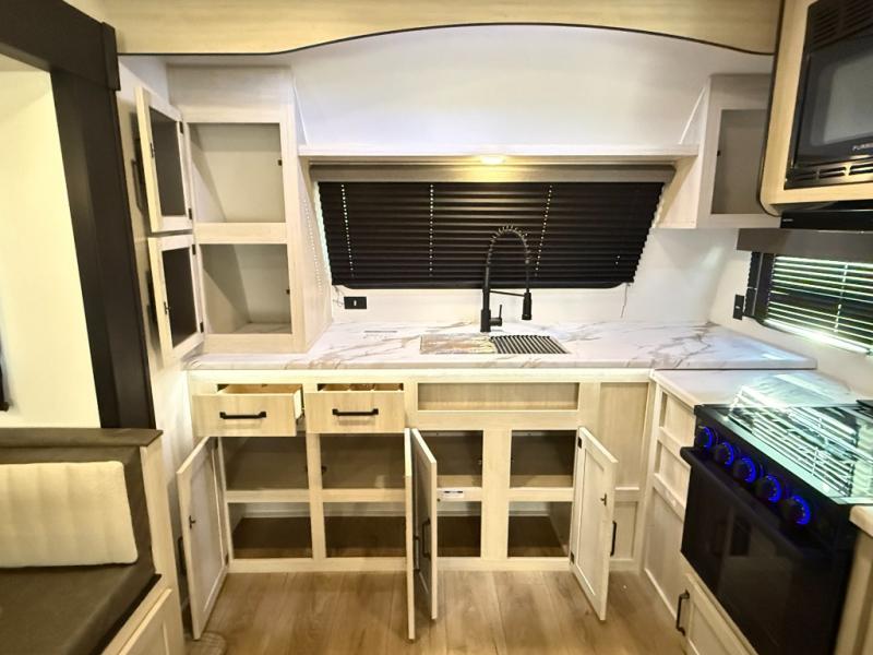 Kitchen: Front kitchen layout—lots of countertop space, overhead cabinets, a scenic front window. Includes residential style appliances (microwave, 3-burner cooktop, large fridge), and a booth dinette.