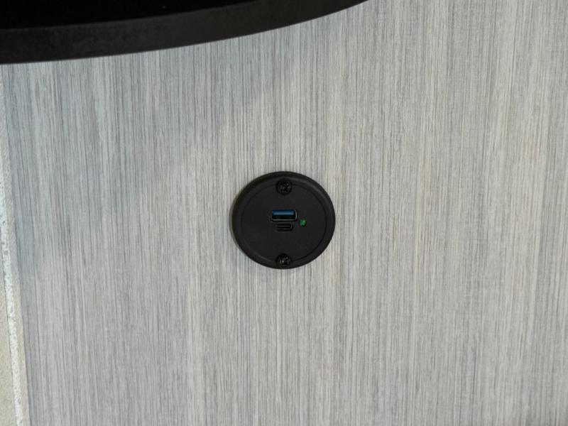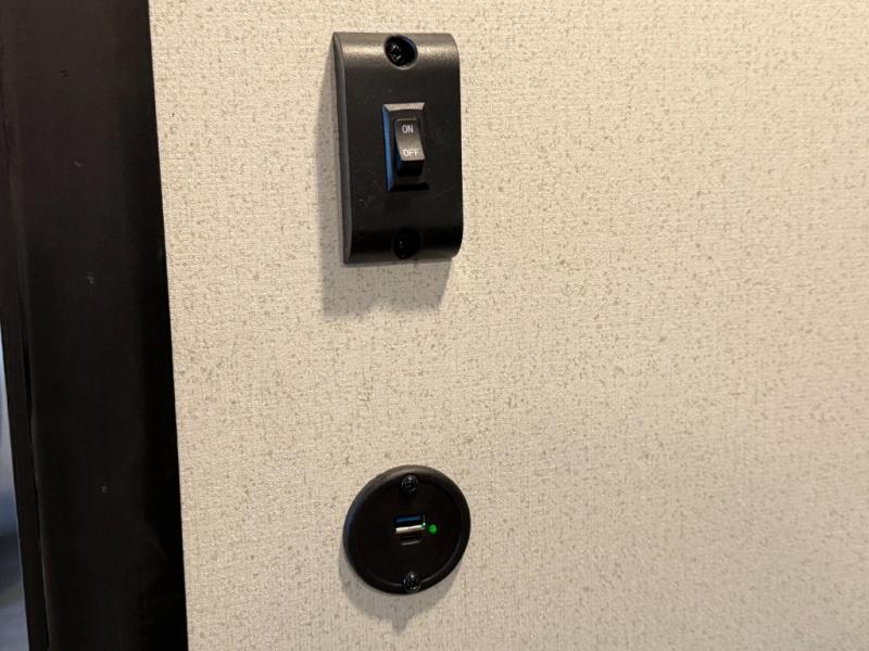 Electric awning with LED strip, outside speakers, outside shower.