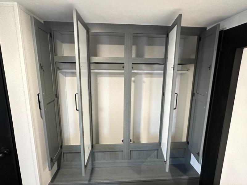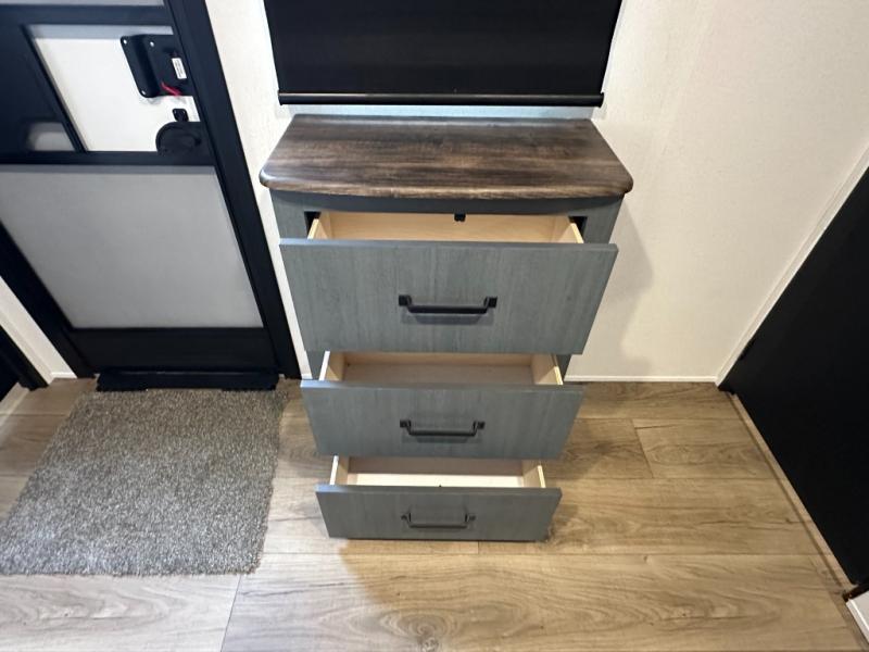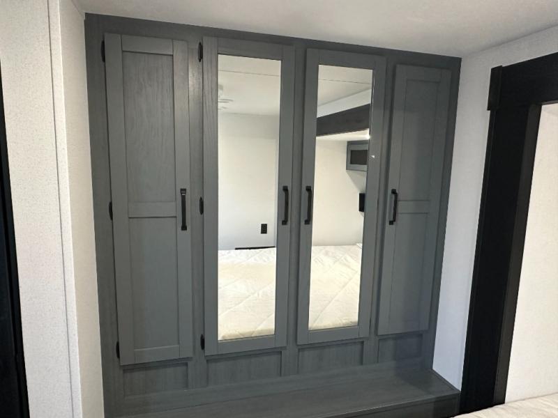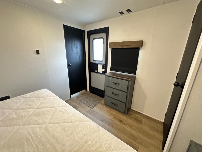 Rear bedroom offers a king-size bed (72×80) on a slide, alongside a dresser, wardrobe, and washer/dryer prep. Dual entry doors make access easy.
