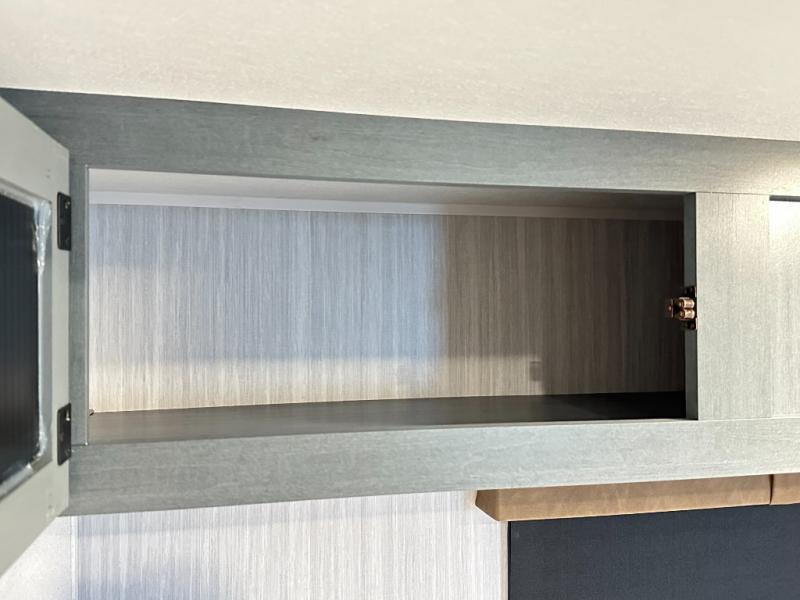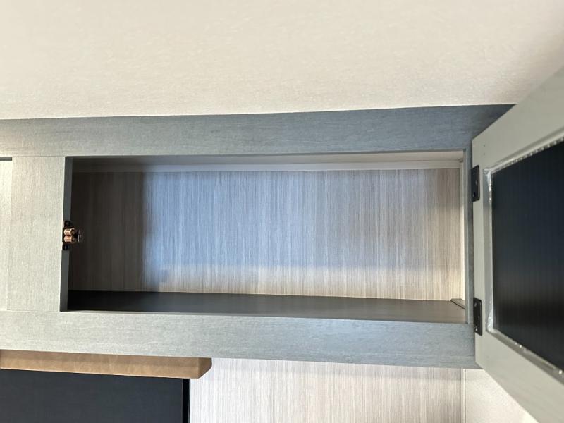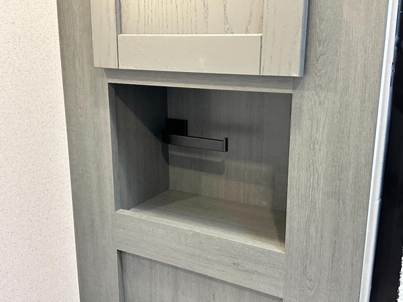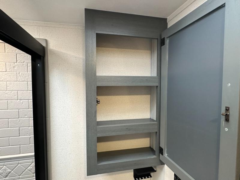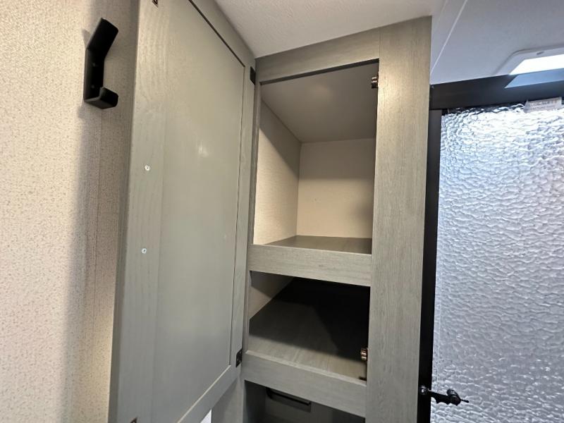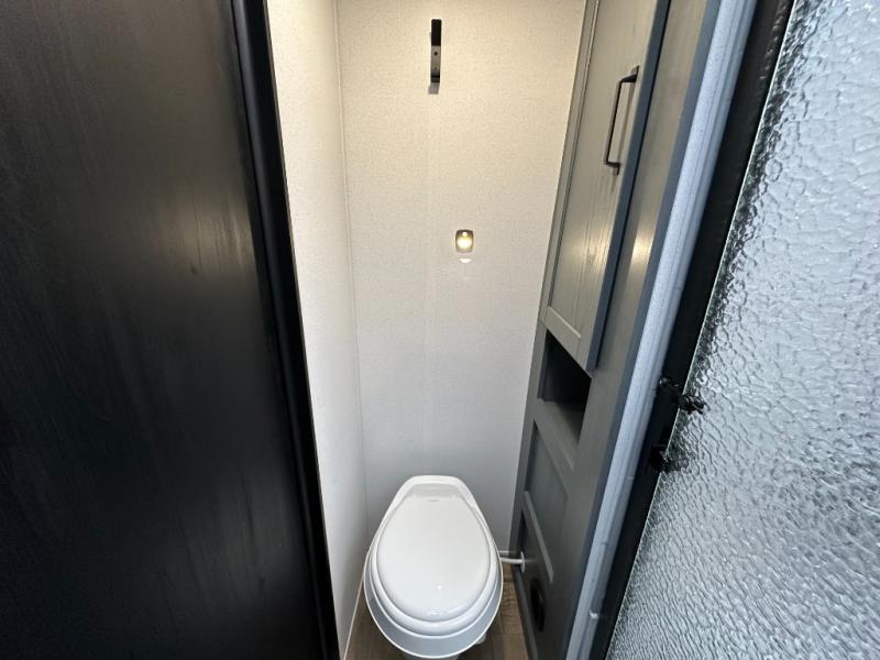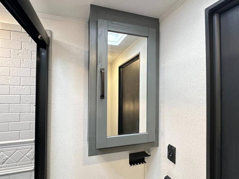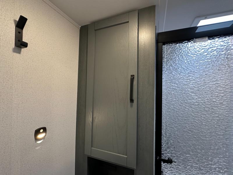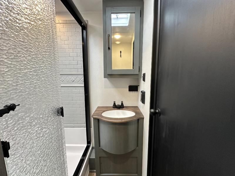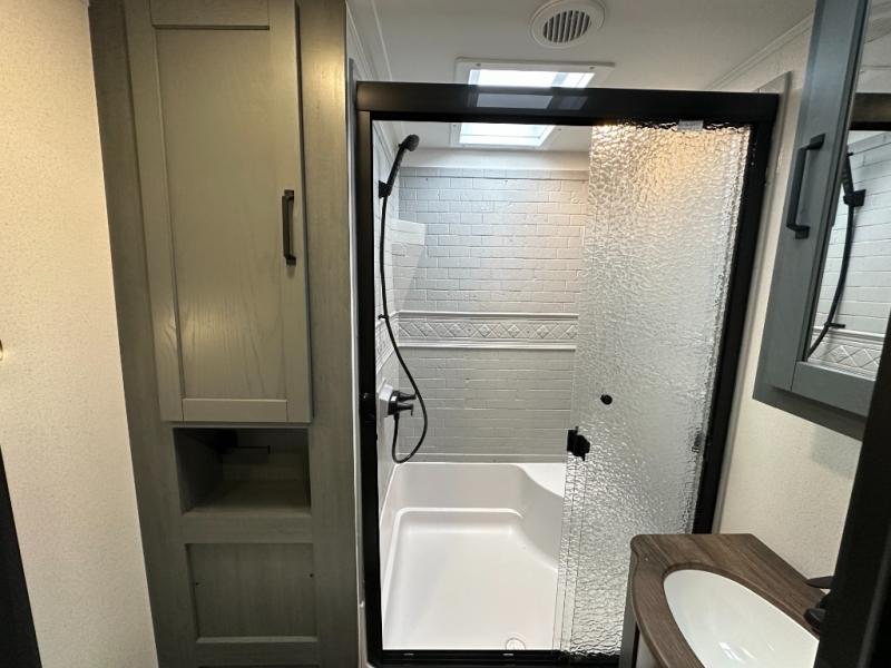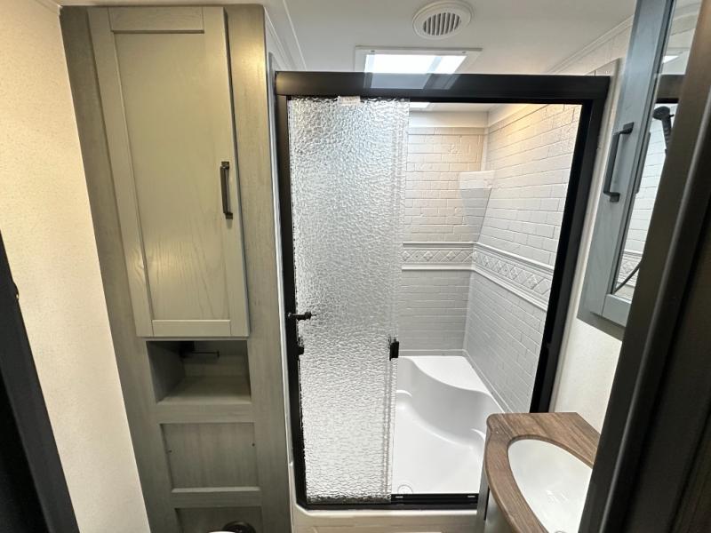 Bathroom includes a residential-style shower, skylight, vanity, and ample storage. Some dealers note a slightly smaller 34×34 radius option possible.