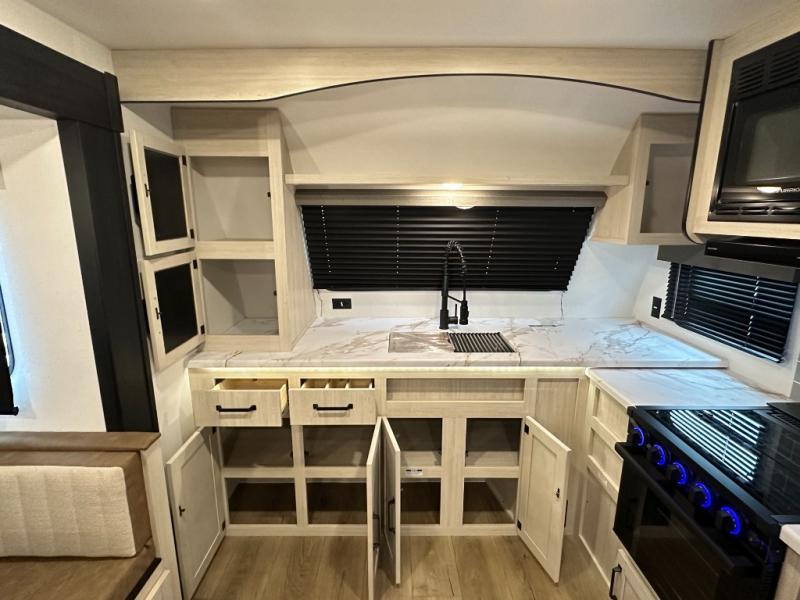 Front kitchen features full-width counters, panoramic window, overhead cabinets, microwave, 3-burner cooktop, and an 11 cu.ft 12V residential black glass fridge. A booth dinette sits nearby for dining.