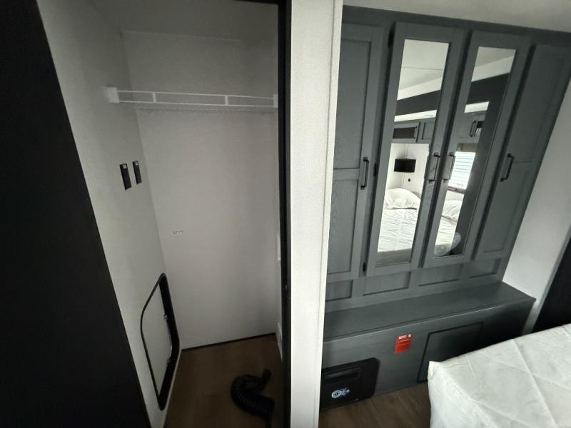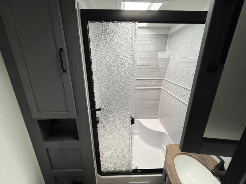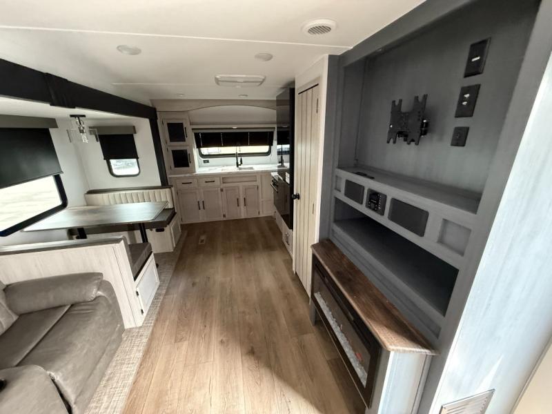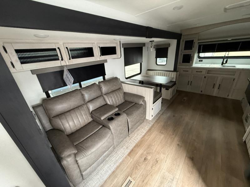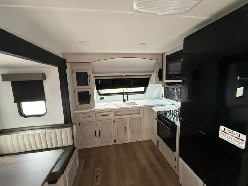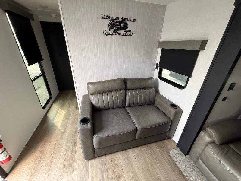 Experience a home away from home with this travel trailer! The front kitchen has everything you will need to prepare your best meals and you can enjoy them at the booth dinette. The rear private bedroom has a 72" x 80" king bed slide across from a dresser, a wardrobe, and a closet with washer and dryer prep. Freshen up in the full bathroom with the 32" x 40" shower and then enjoy a cup of coffee relaxing in one of the two recliners or on the sofa! Choose the optional outside micro kitchen with a griddle for even more convenience!