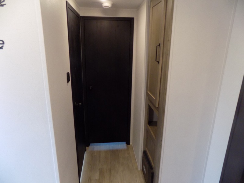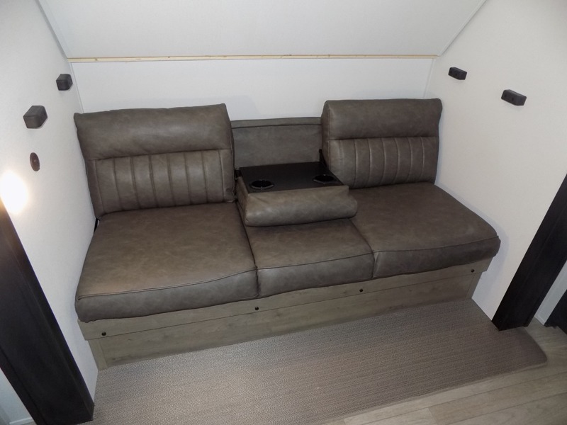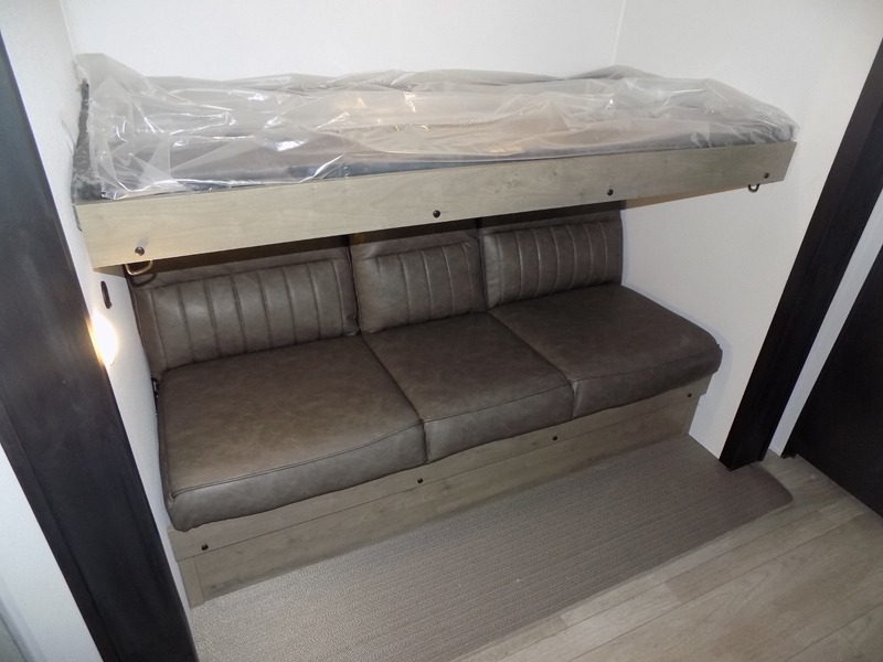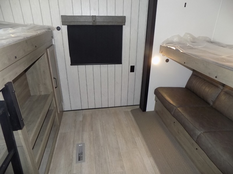 The kids will love having their own rear private bunkhouse in this travel trailer! Inside the bunkhouse is a 38" x 76" bunk above an entertainment center, a closet, and a 32" x 69" bunk above a jiffy sofa slide. The full bathroom with a 34" x 34" radius shower is just outside the bunkhouse for them to easily access it at night. They can even invite a friend or two to tag along and sleep on the sofa and U-shaped dinette once converted. Behind the entertainment center is a closet/pantry to keep your favorite snacks and the kitchen has a 12V refrigerator to keep your beverages cold. When you're ready to wind down your nights, head to the front private bedroom and relax on the queen bed with shirt closets and nightstands on either side of it, plus it has one of the dual entry doors to the unit! This model also includes two outside kitchen options if you enjoy cooking in the fresh outdoors!