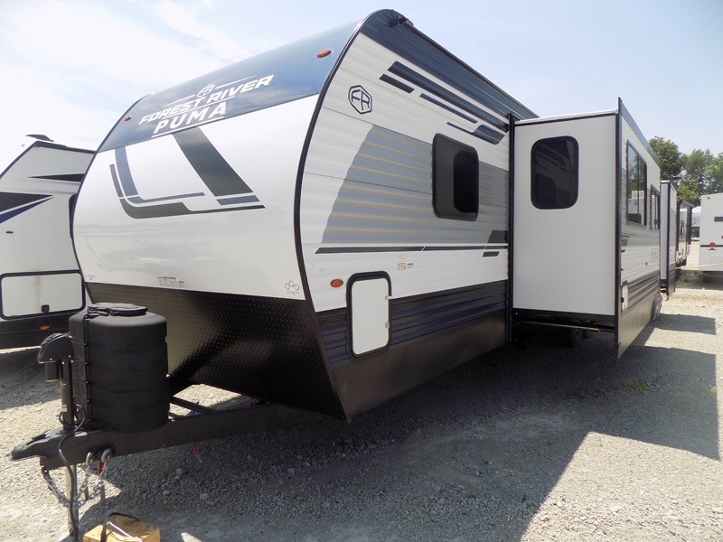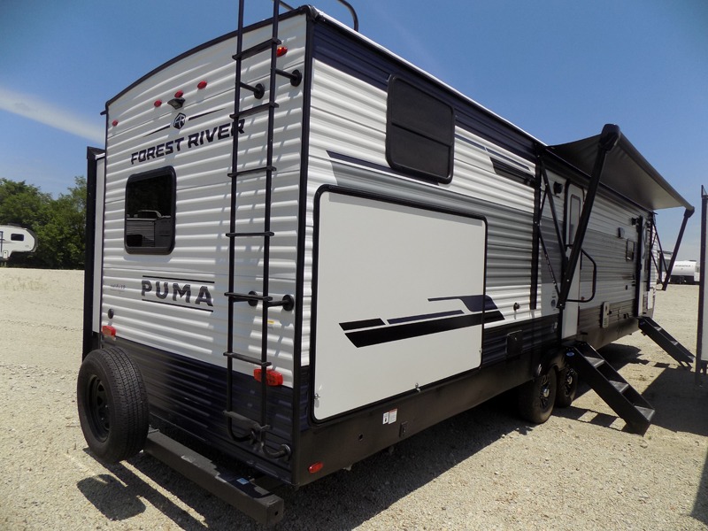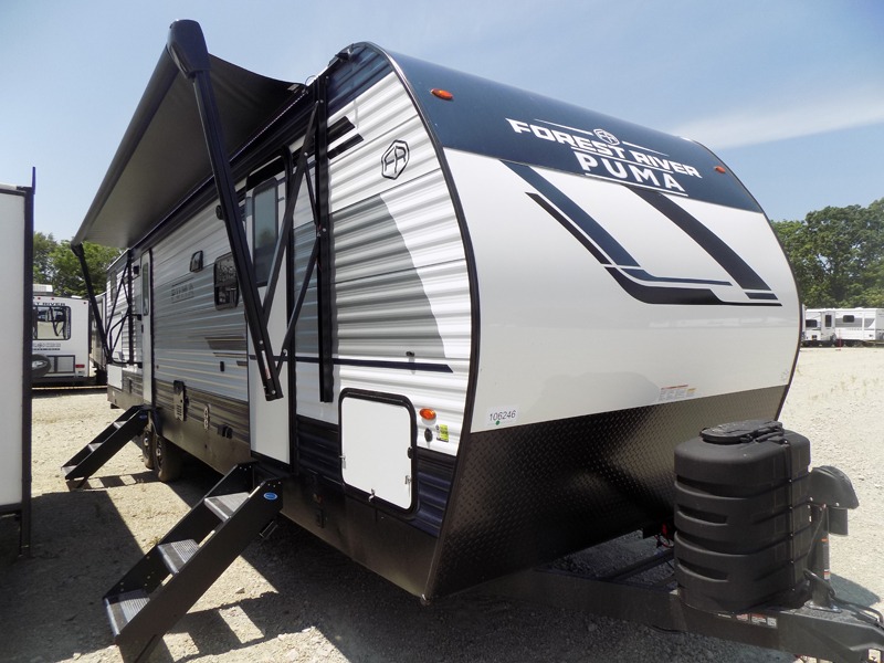 If you're looking for family-fun adventures then you need one of these Palomino Puma fifth wheels or travel trailers! They are built rugged, easy to tow, and jam packed with features. The Darco wrapped underbelly will protect your units vitals and the AlphaPly roofing membrane covers it. They also have new aluminum wheels and a powder coated steel I-beam frame. Inside, the Congoleum linoleum will be easy to keep clean, and the night roller shades will provide privacy when it's time to turn in. You'll also enjoy an electric awning with an LED light strip plus an AM/FM/Bluetooth stereo and two outside speakers to keep the party going!
