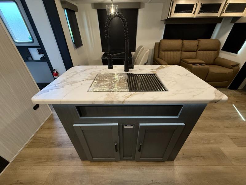Kitchen island: Center kitchen island with stainless steel sink, high-rise sprayer faucet, pantry, 3-burner oven & range.