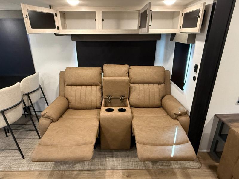 Rear living area: At the back you get a sofa, a pair of recliners, and a booth dinette all facing an entertainment center.