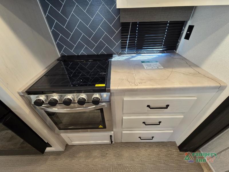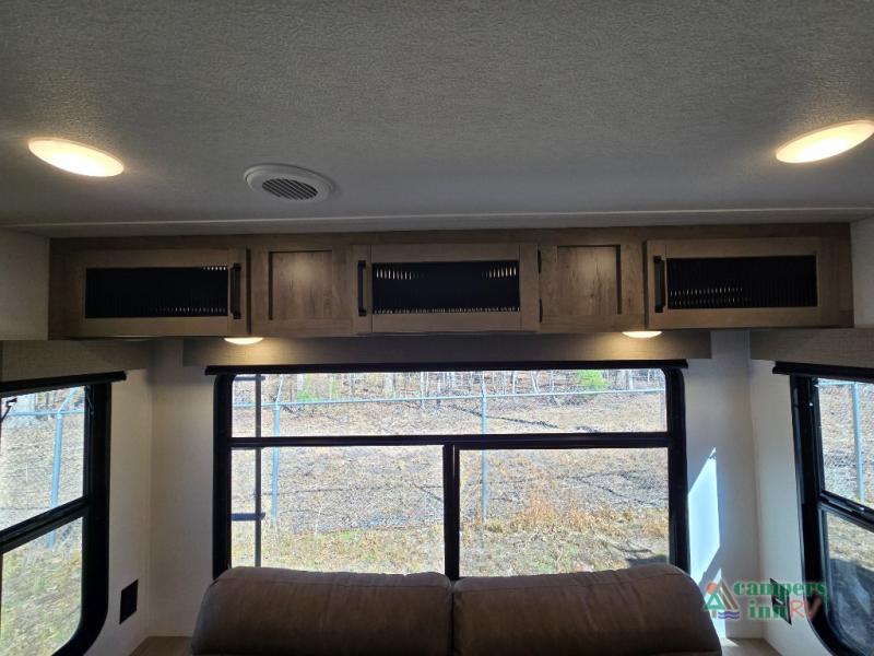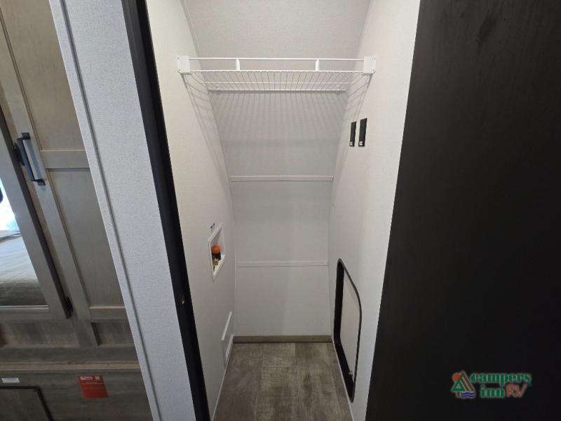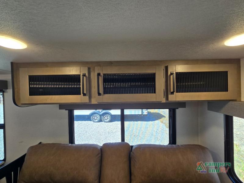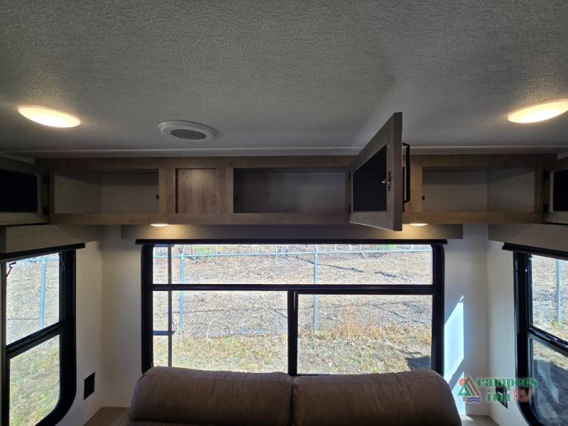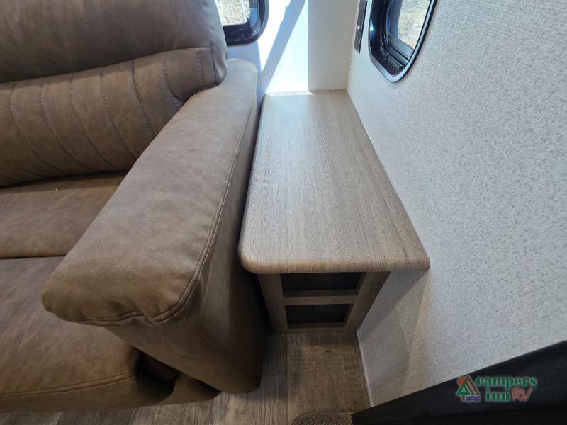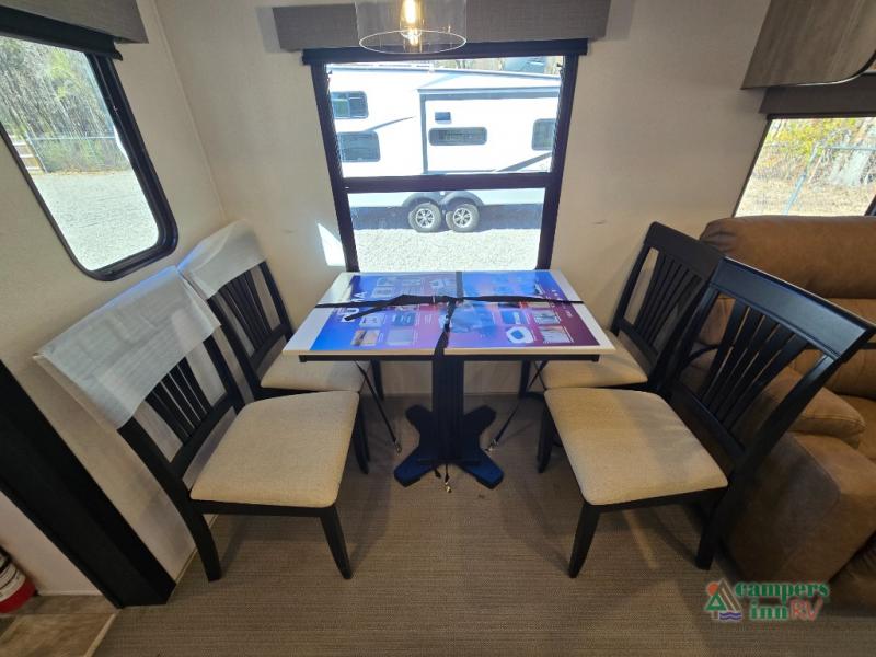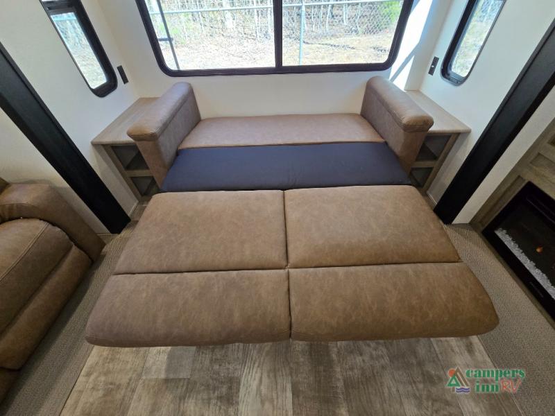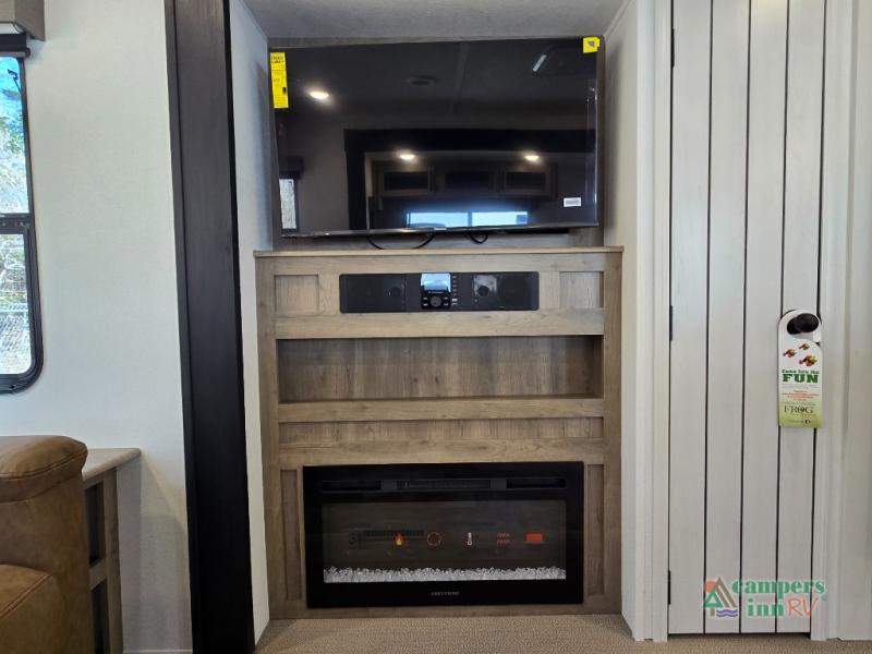 You're going to feel right at home in this travel trailer! The front private bedroom has a queen bed slide for a good night's rest, a dresser and front closet for your clothes, and another closet with washer and dryer prep. Freshen up each morning in the full bathroom with the 32" x 40" shower with a seat and then head to the kitchen to fry up some eggs on the stainless steel oven and range. You will also appreciate having a kitchen island for easier meal prep and a walk-in pantry to easily see your canned goods and snacks. The booth dinette offers a comfortable place to dine, play, and even sleep once converted. What better way to wind down your nights than to relax on either the rear sofa or in one of the two recliners across from the entertainment center with a fireplace!