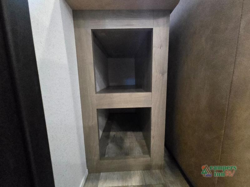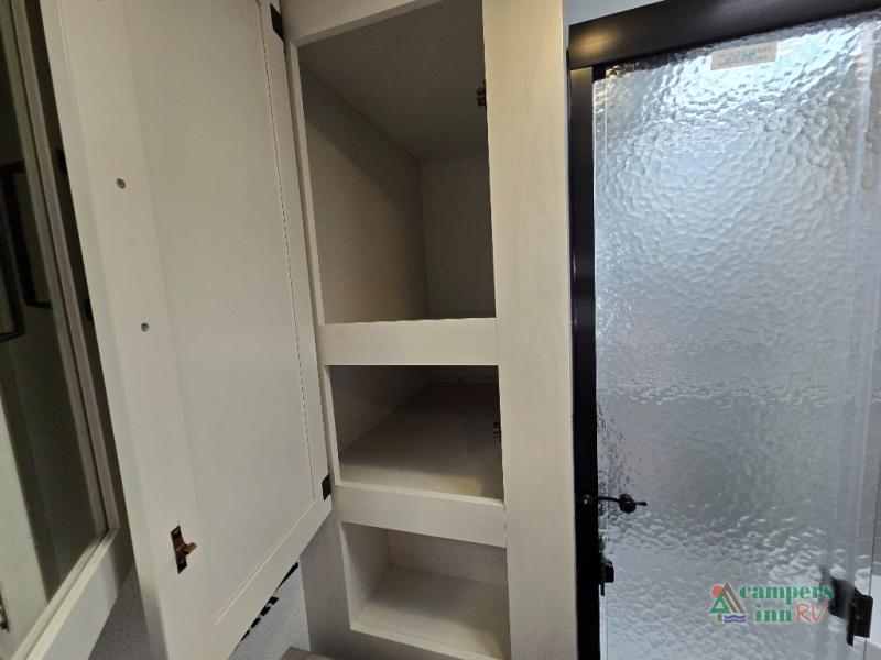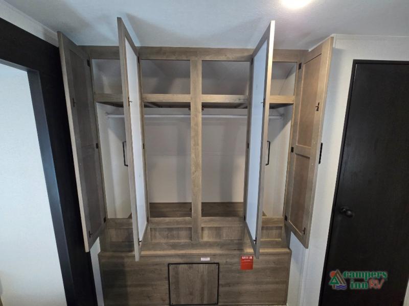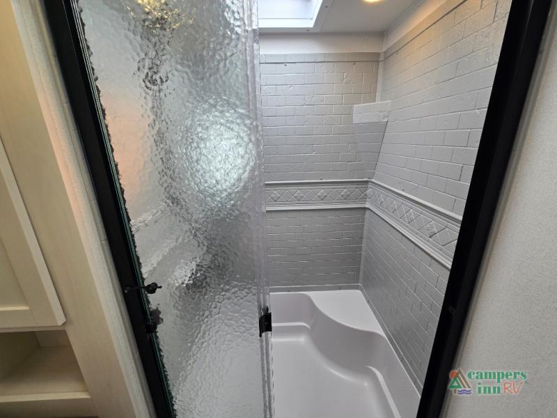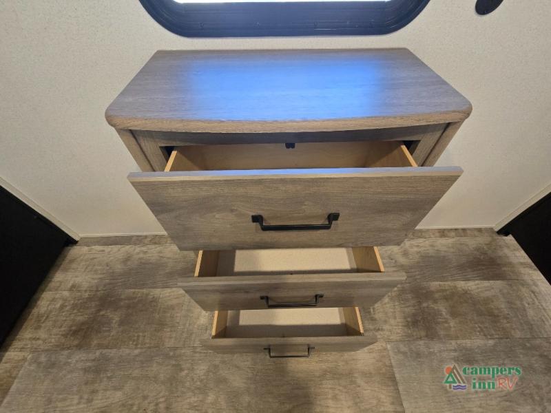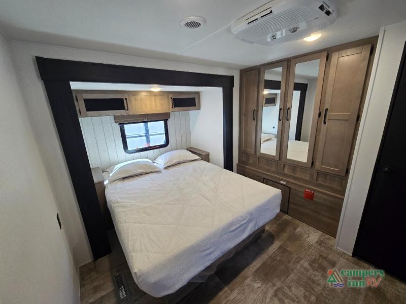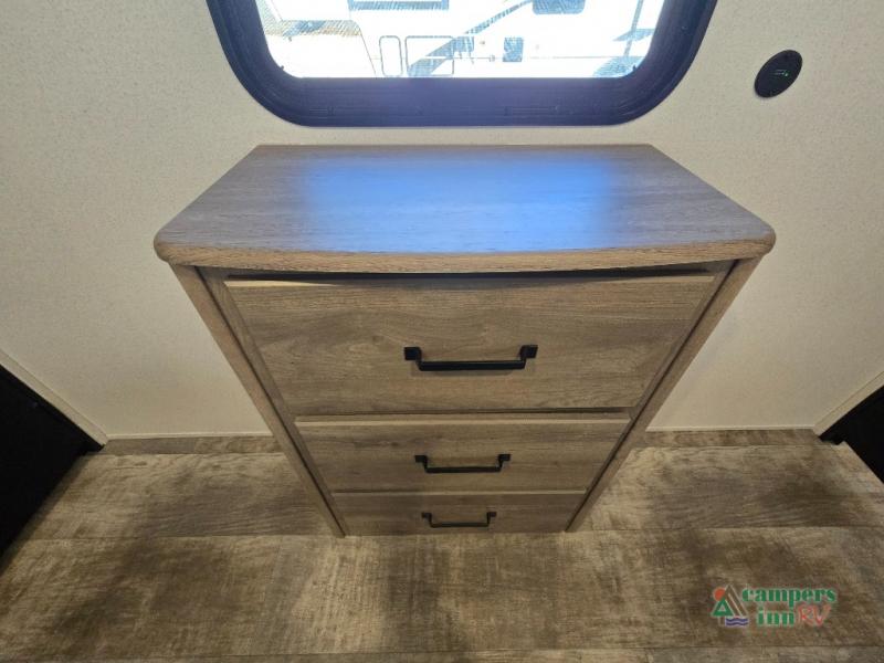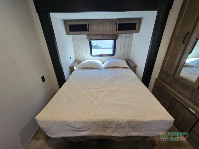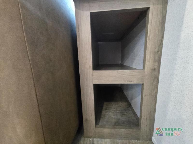 You're going to feel right at home in this travel trailer! The front private bedroom has a queen bed slide for a good night's rest, a dresser and front closet for your clothes, and another closet with washer and dryer prep. Freshen up each morning in the full bathroom with the 32" x 40" shower with a seat and then head to the kitchen to fry up some eggs on the stainless steel oven and range. You will also appreciate having a kitchen island for easier meal prep and a walk-in pantry to easily see your canned goods and snacks. The booth dinette offers a comfortable place to dine, play, and even sleep once converted. What better way to wind down your nights than to relax on either the rear sofa or in one of the two recliners across from the entertainment center with a fireplace!