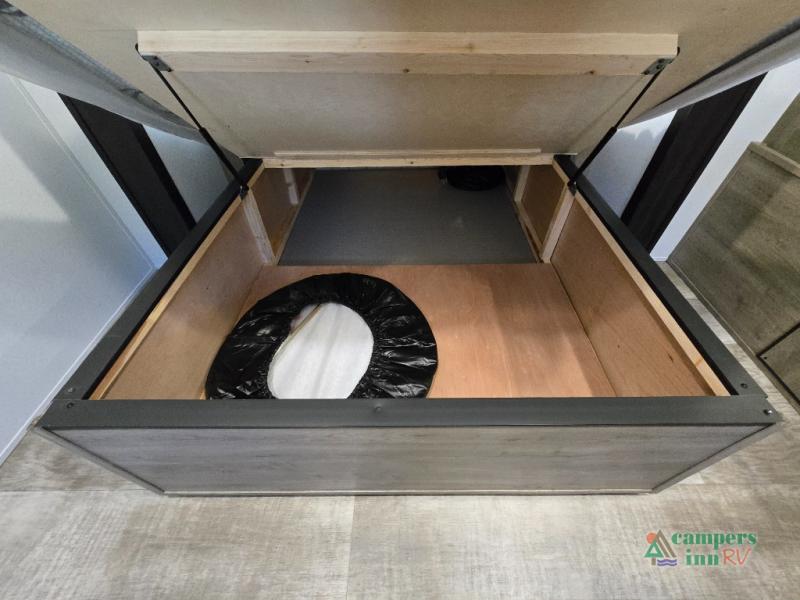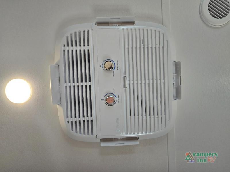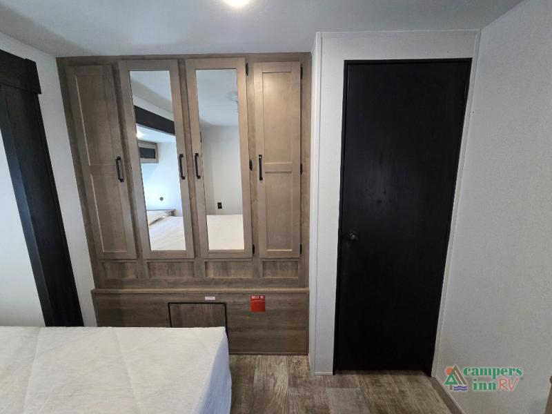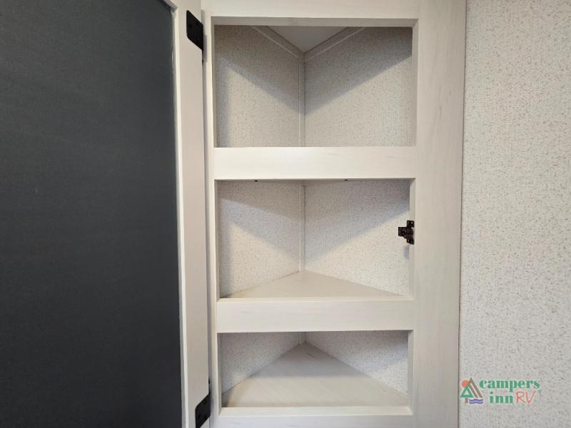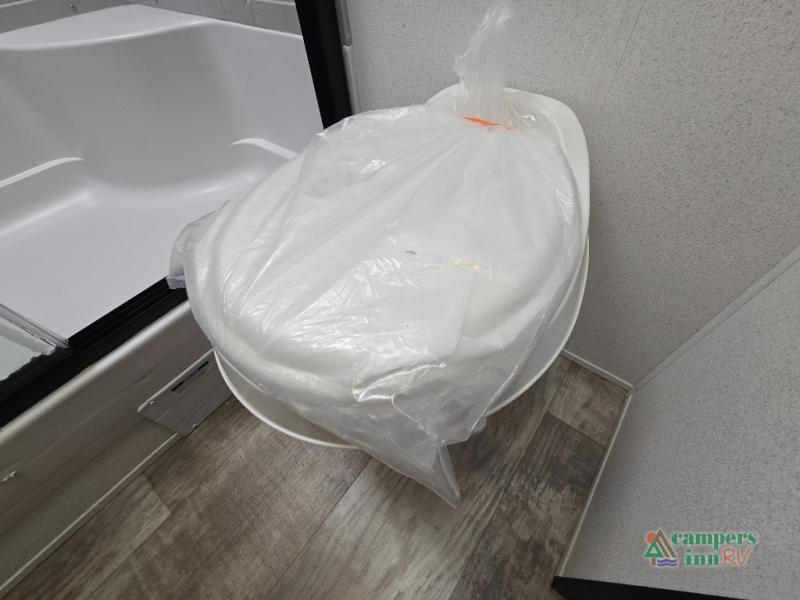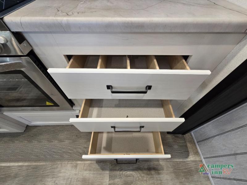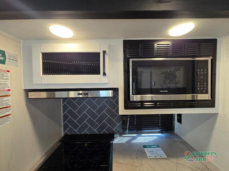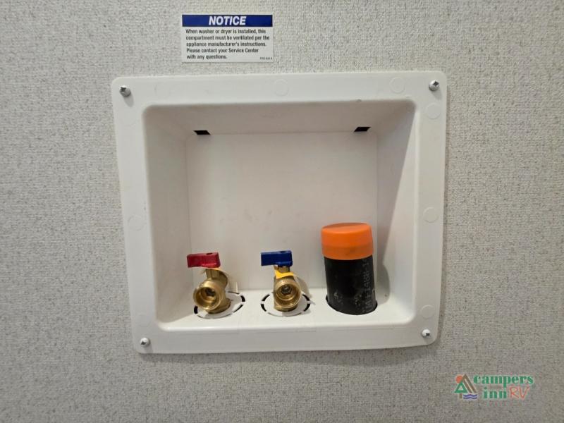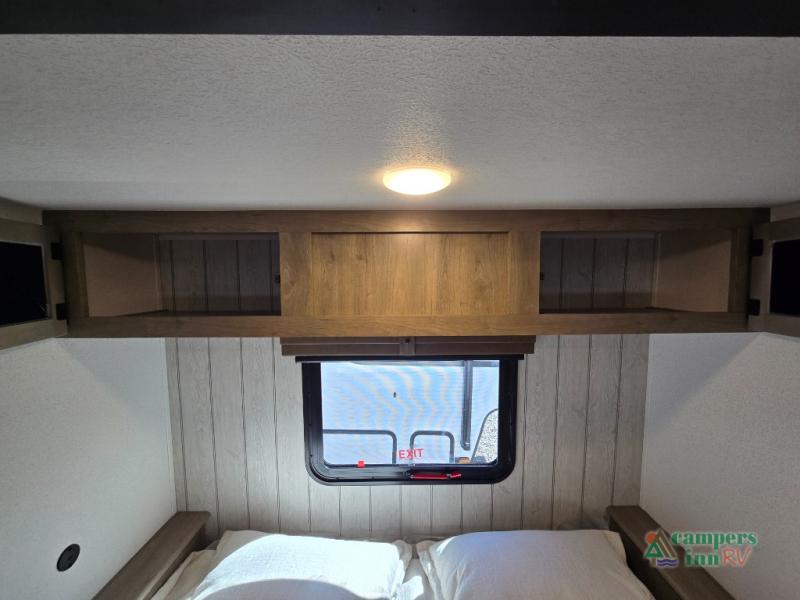 You're going to feel right at home in this travel trailer! The front private bedroom has a queen bed slide for a good night's rest, a dresser and front closet for your clothes, and another closet with washer and dryer prep. Freshen up each morning in the full bathroom with the 32" x 40" shower with a seat and then head to the kitchen to fry up some eggs on the stainless steel oven and range. You will also appreciate having a kitchen island for easier meal prep and a walk-in pantry to easily see your canned goods and snacks. The booth dinette offers a comfortable place to dine, play, and even sleep once converted. What better way to wind down your nights than to relax on either the rear sofa or in one of the two recliners across from the entertainment center with a fireplace!