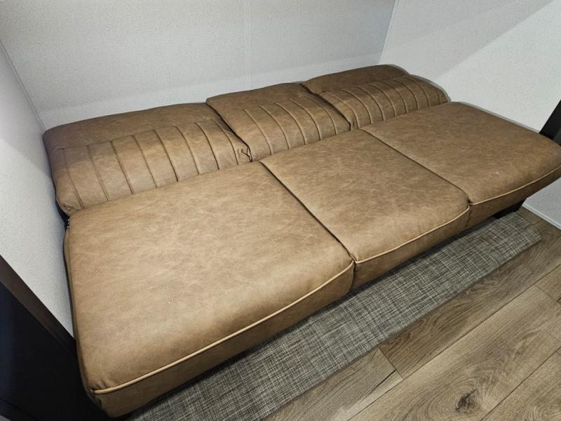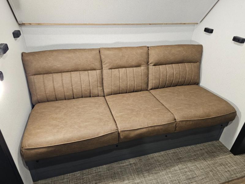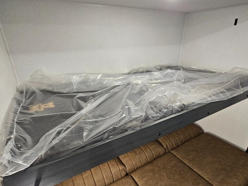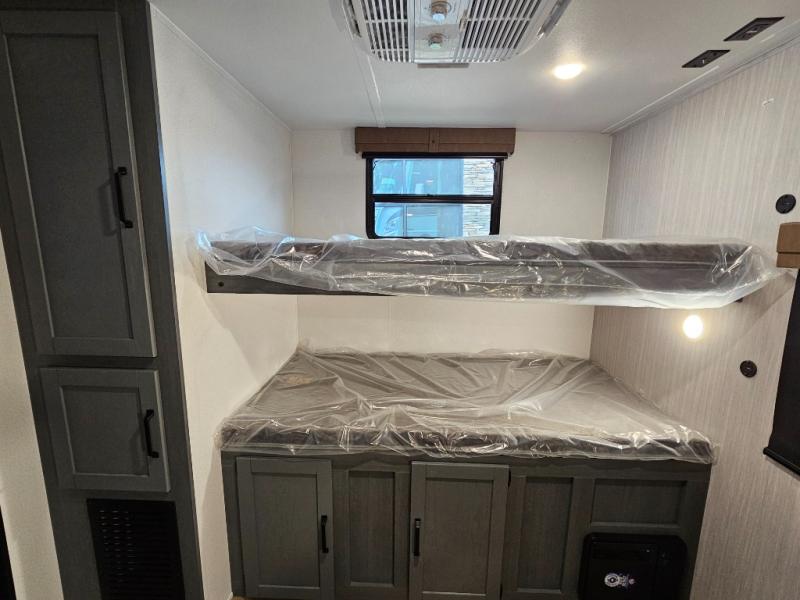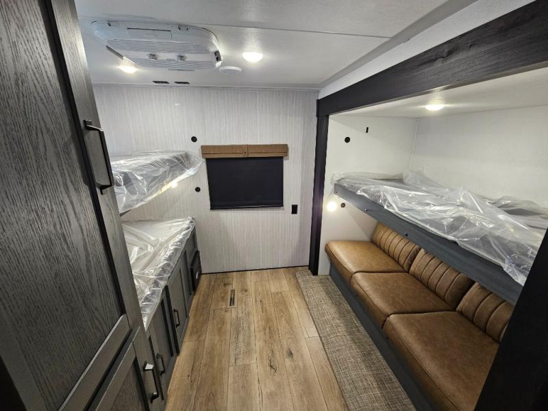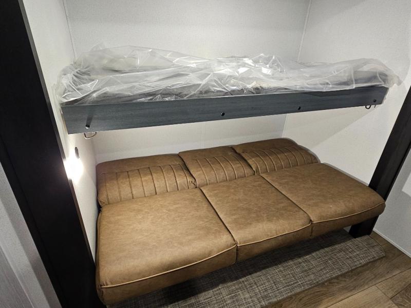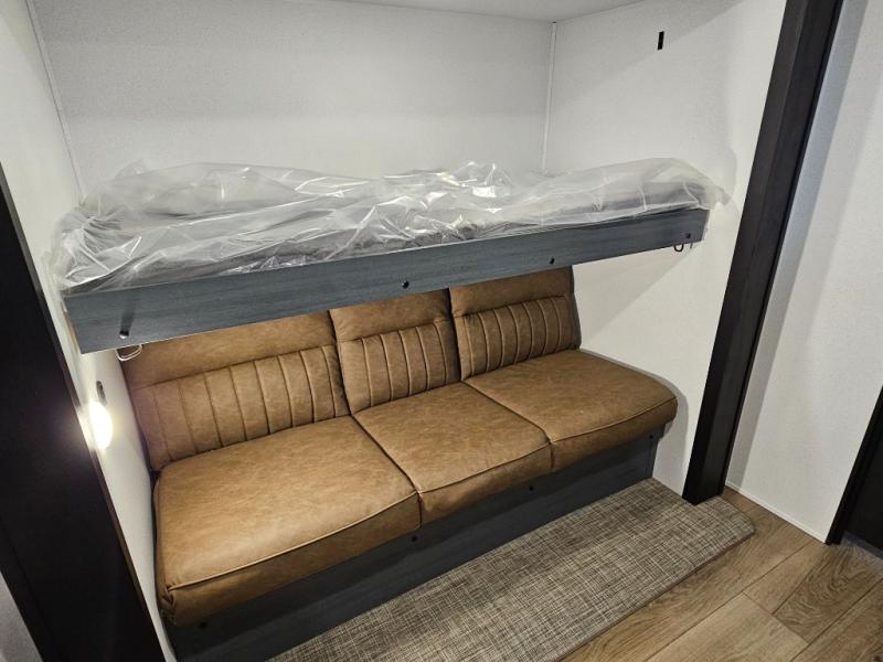 Spacious rear bunkhouse featuring a 32" x 69" bunk above a jiffy sofa slide, plus a 36" x 69" bunk above a 36" x 71" bunk — perfect for kids or guests.