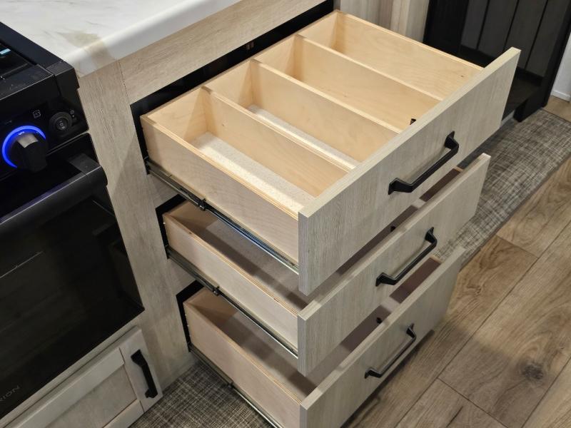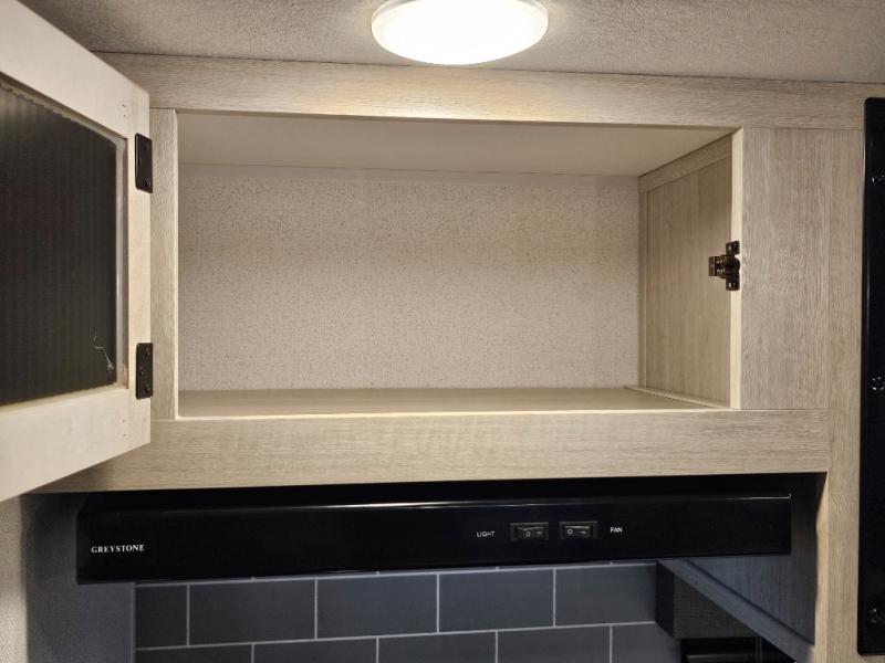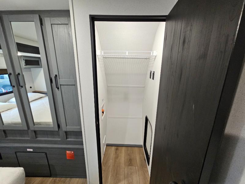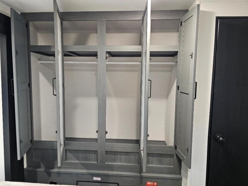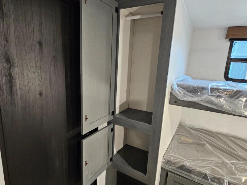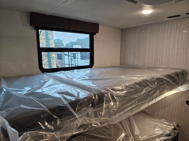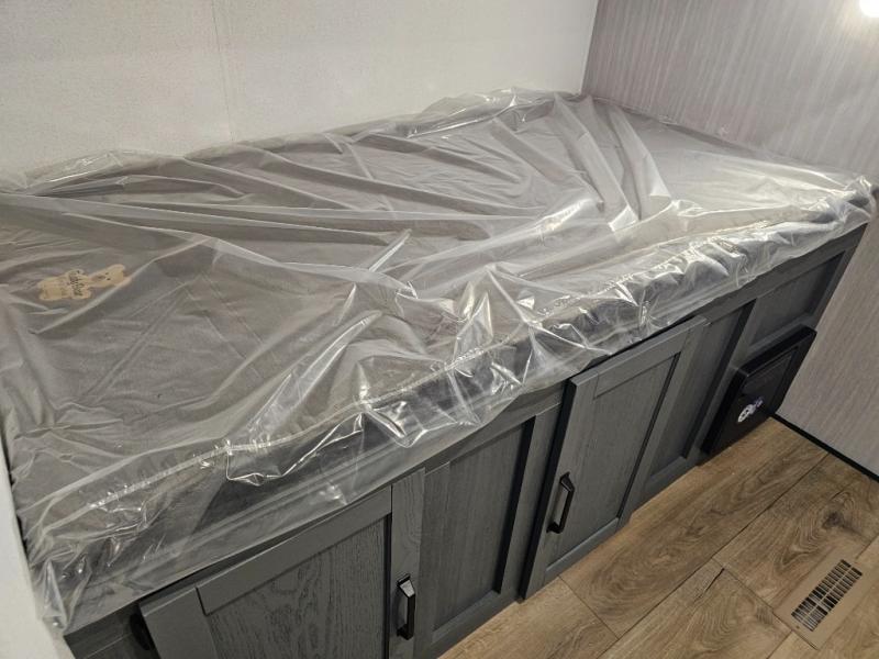 Spacious rear bunkhouse featuring a 32" x 69" bunk above a jiffy sofa slide, plus a 36" x 69" bunk above a 36" x 71" bunk — perfect for kids or guests.