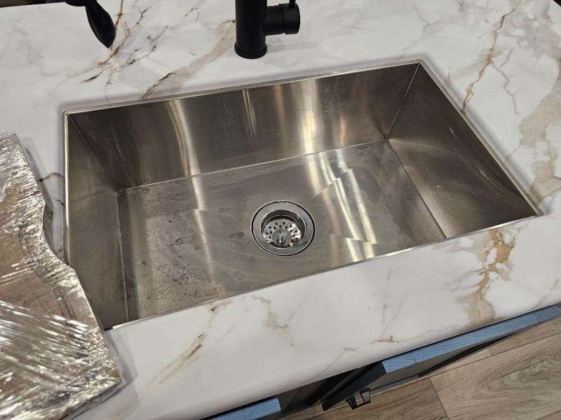 Kitchen island with high-rise faucet and sprayer for easy prep and cleanup.