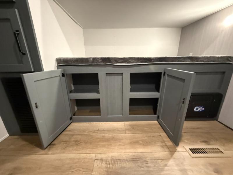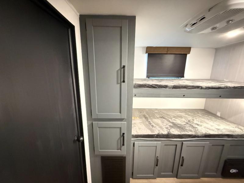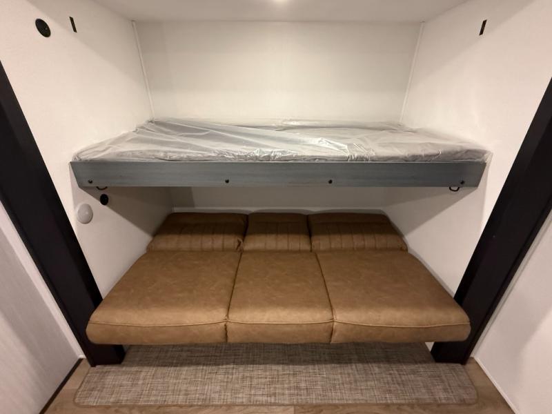 Multiple bunks: a 32" × 69" bunk above a jiffy sofa slide; another 36" × 69" bunk above a 36" × 71" bunk. Linen closet included. -