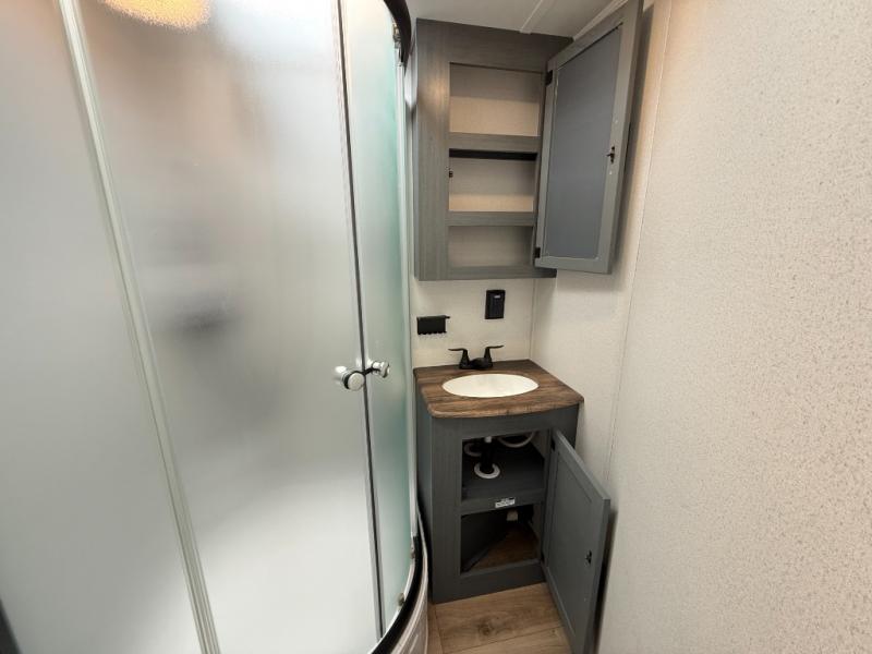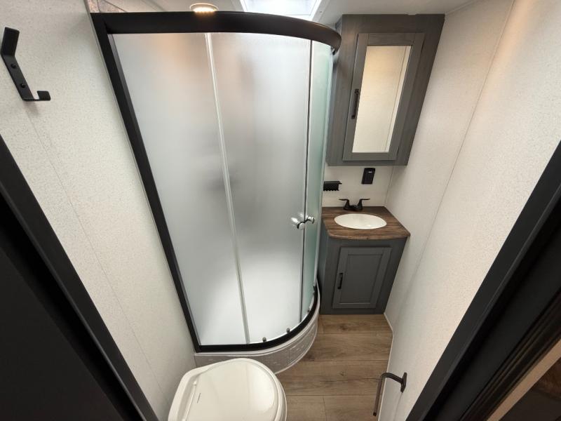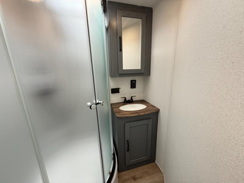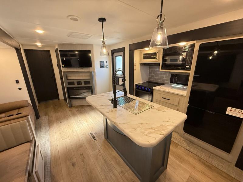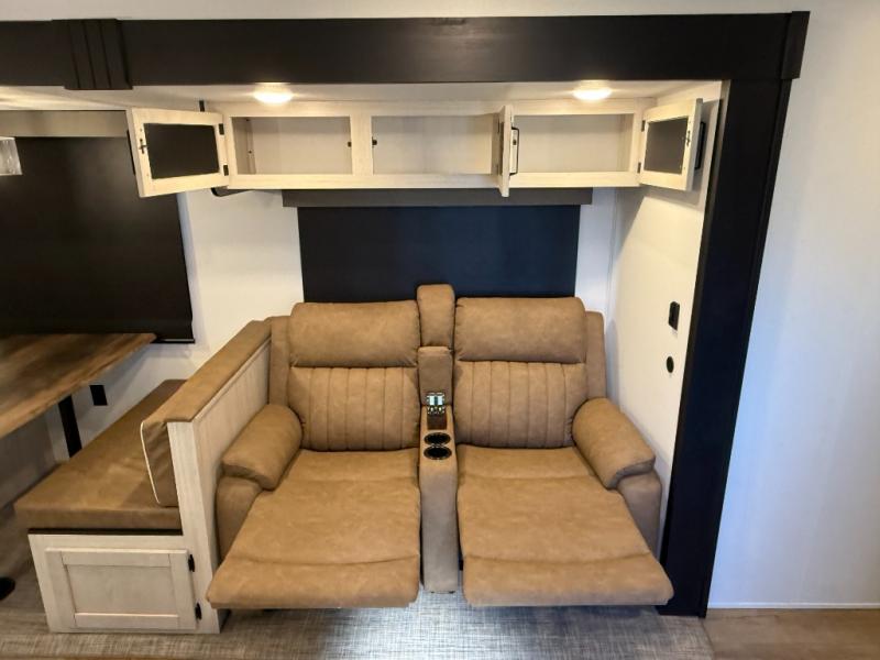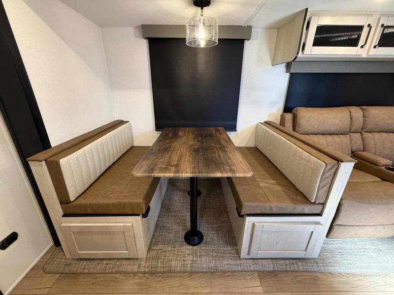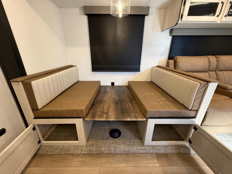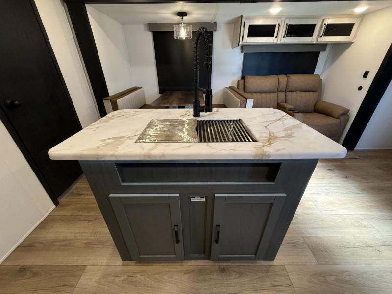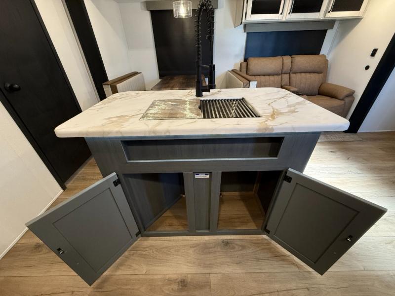 Booth dinette, kitchen island (with sink, high-rise faucet + sprayer), theater seating (in many units), full bathroom with a radius shower (34" × 34")