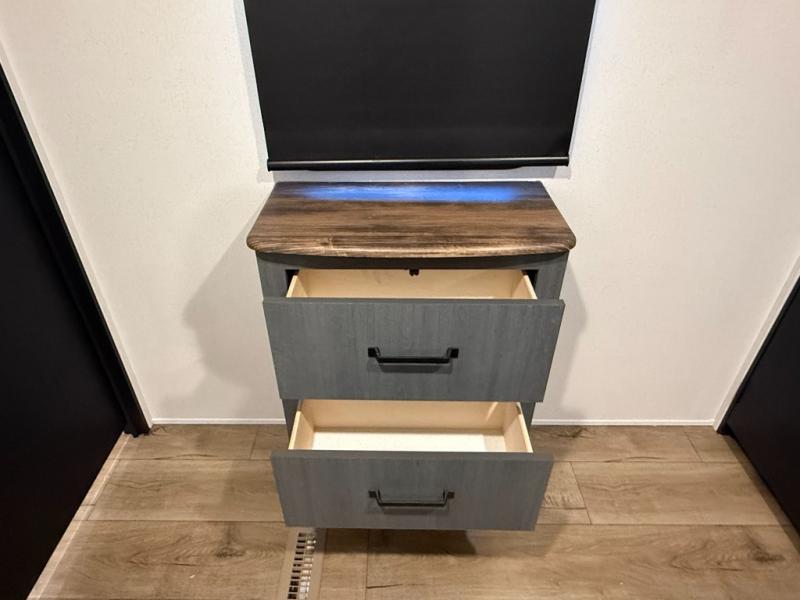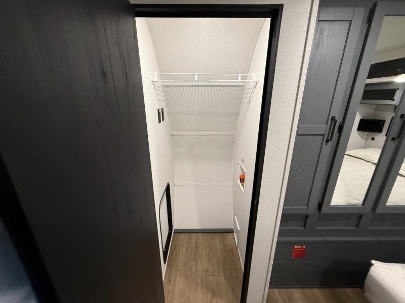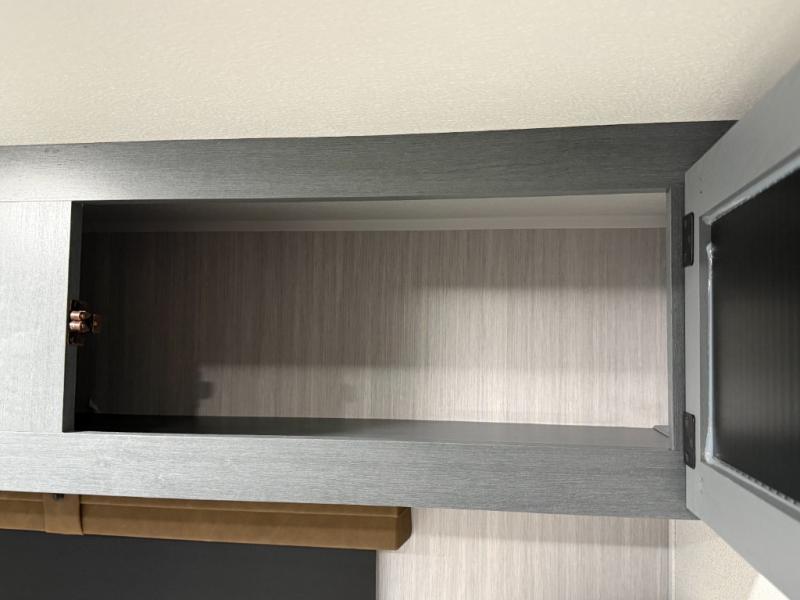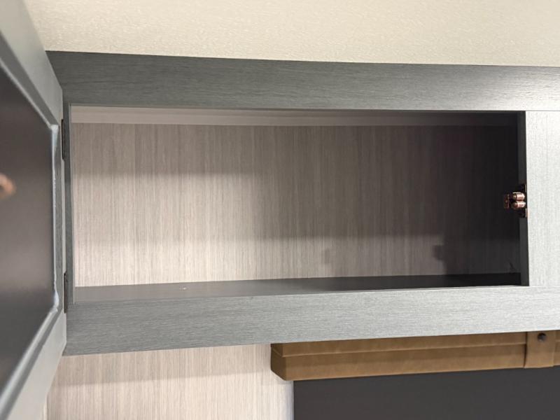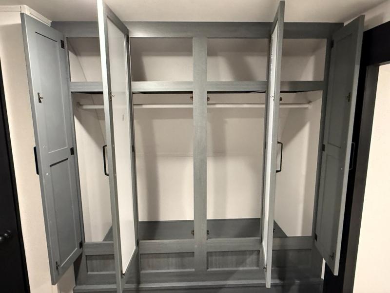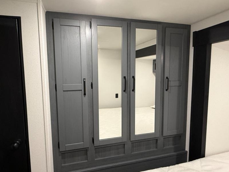 Front master bedroom: Queen bed slide; dual wardrobes & overhead storage.