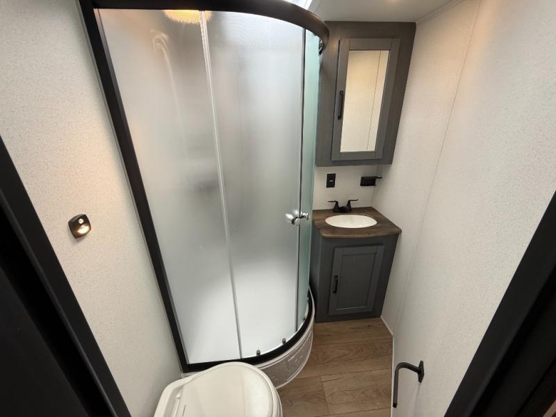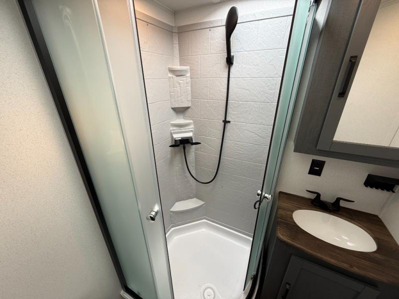 Full bath with 34? × 34? radius shower, vanity, toilet.