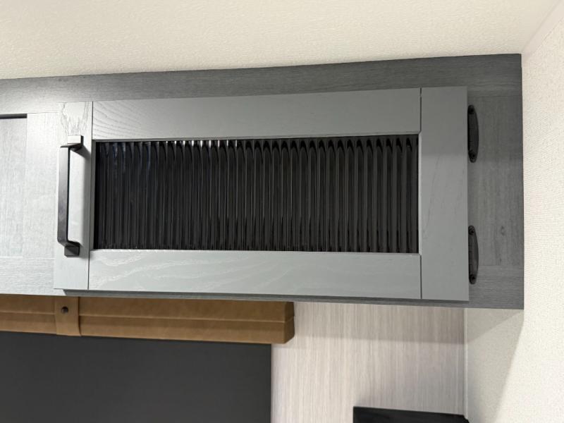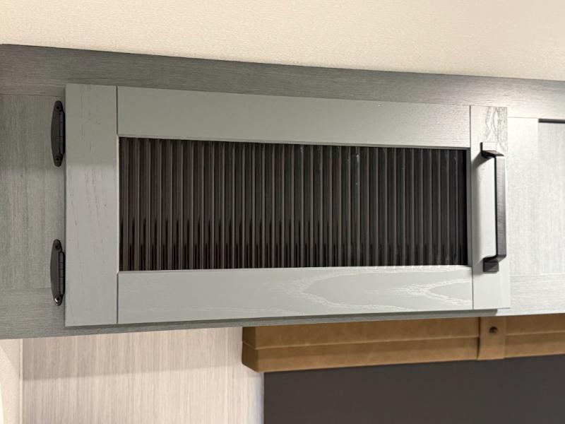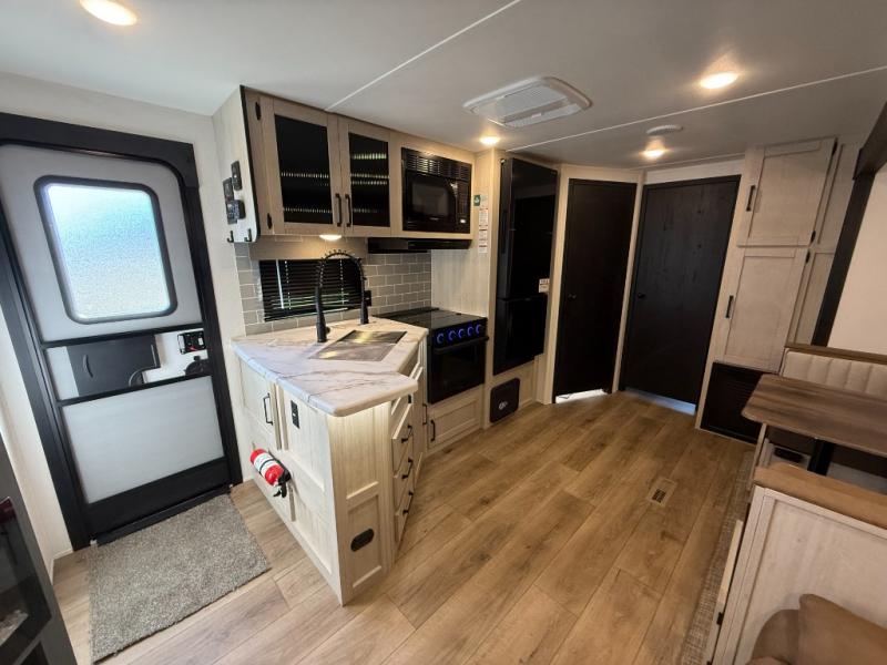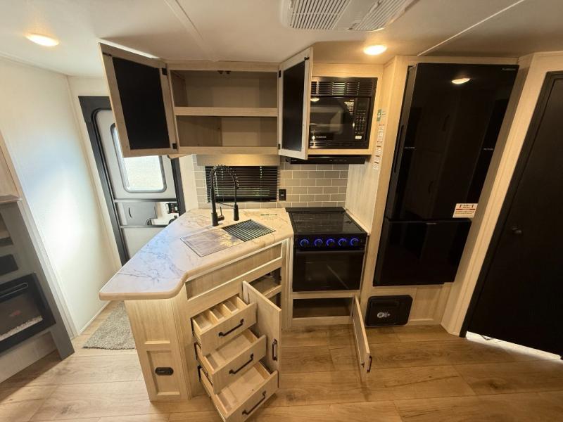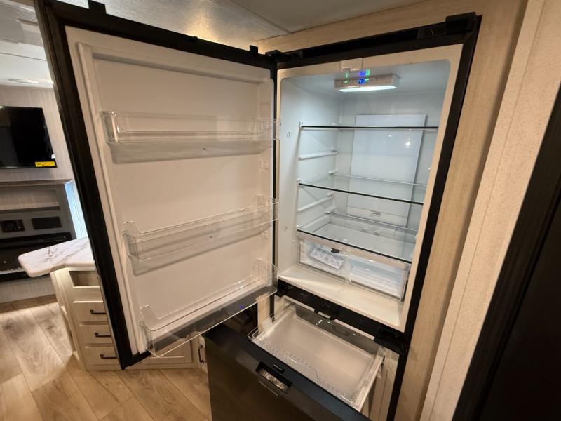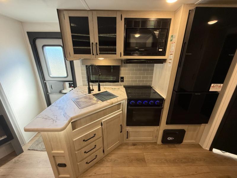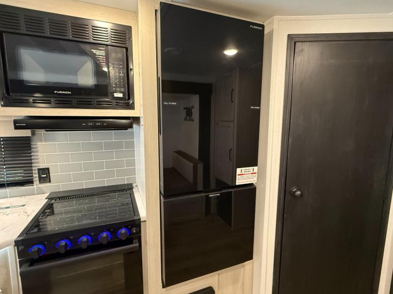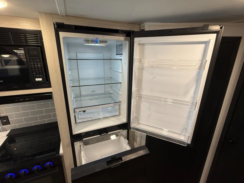 Indoor kitchen: stainless steel oven & range (3-burner), microwave, residential-size refrigerator (~ 11 cu ft, 12V black glass), pantry storage.