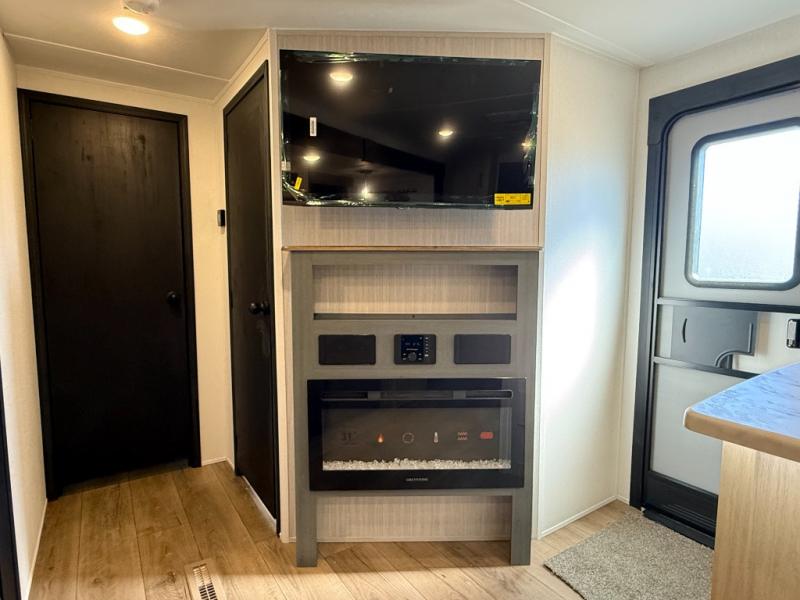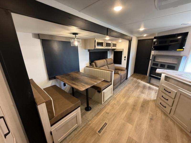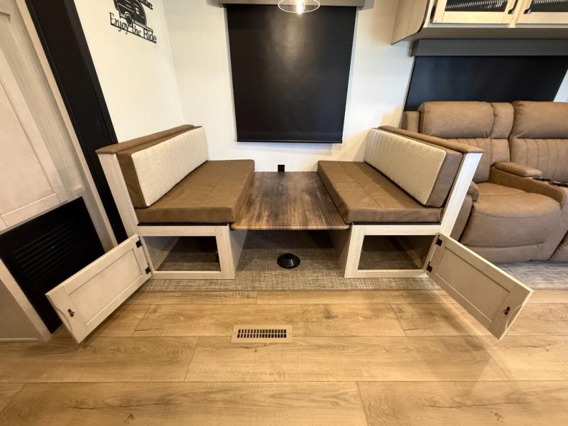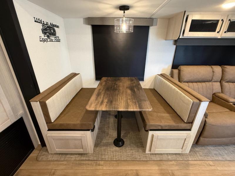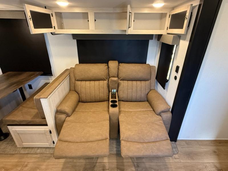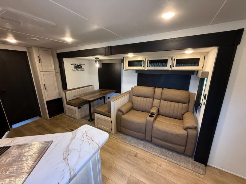Living area: large slide-outs, booth dinette, jackknife sofa; many units offer theater seating as an upgrade. Entertainment center present; fireplace in “Limited Edition” package in some units.