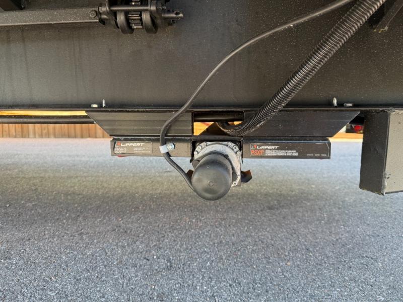Features like solid triple steps, electric stabilizers, electric awning with LED lighting, solar prep.