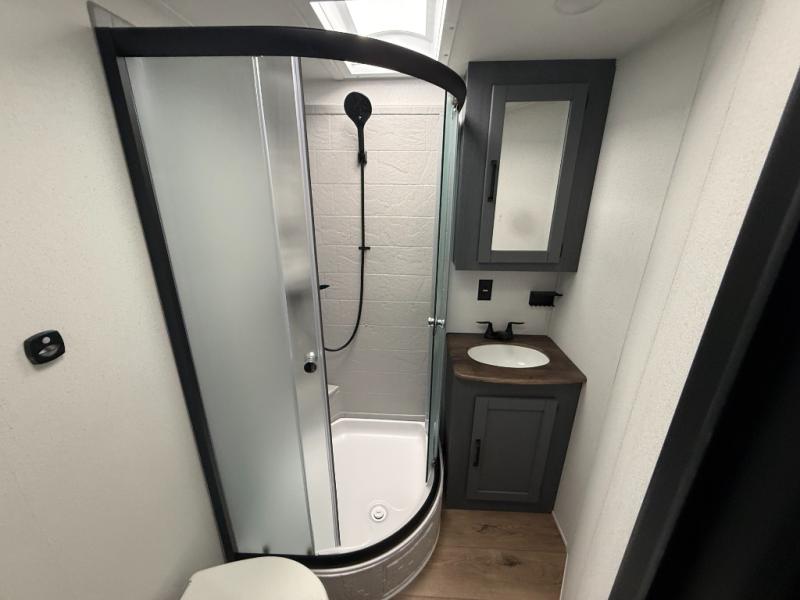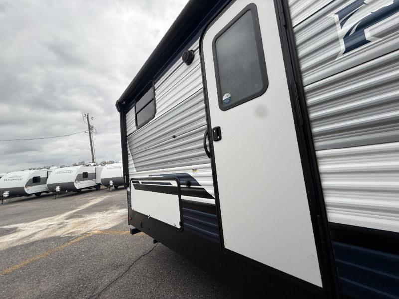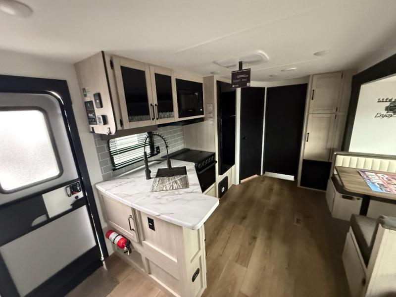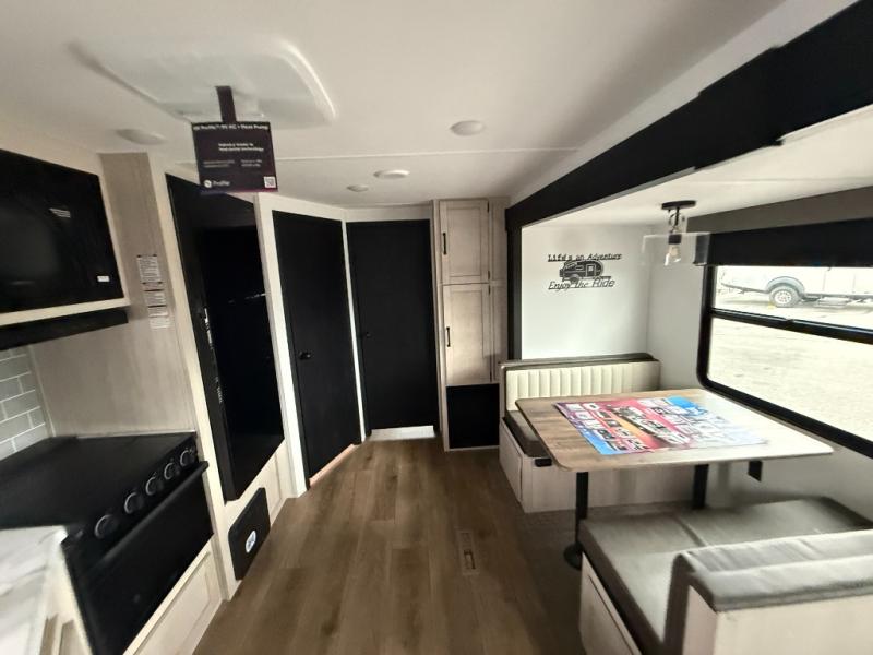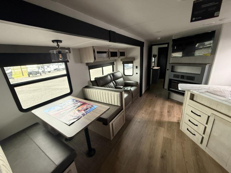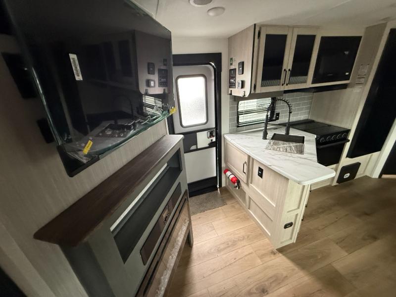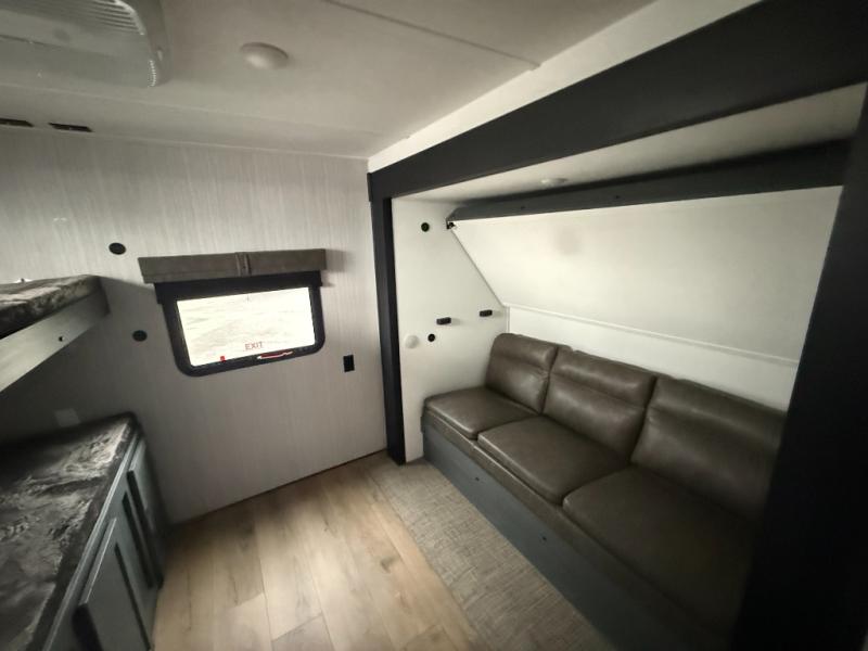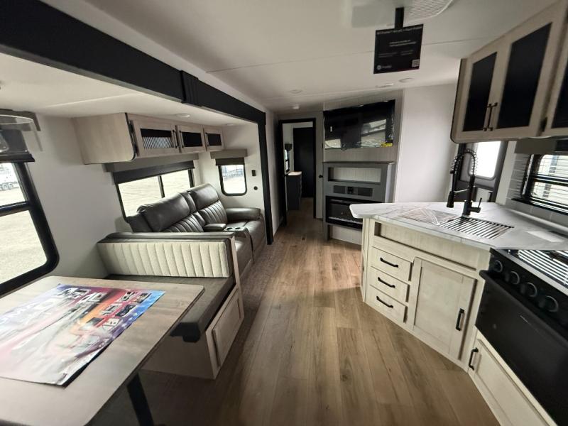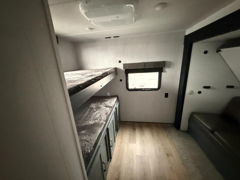 With dual entry doors and a bath and a half, you will have the ultimate in convenience with this travel trailer! The bedroom also has a front closet to keep your clothes looking their best and a queen bed slide for you to sleep your best. Everyone can freshen up in the full bathroom with the 34" x 34" radius shower and fill their bellies with scrambled eggs cooked with the stainless steel oven and range. Enjoy your meals, play games, and even sleep at the booth dinette or relax on the sofa while watching a movie with the entertainment center and fireplace. And your guests will love the rear private bunkhouse with three bunks, a jiffy sofa, and a slide out for more space! This model also includes an optional outside mini kitchen with a griddle!