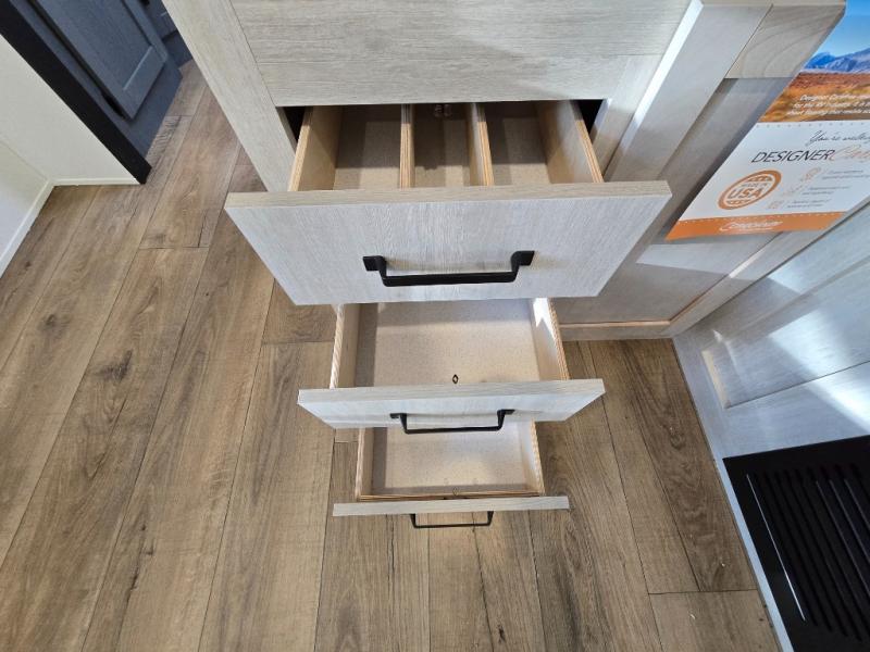 The heart of the trailer is the open living and kitchen area, complete with a large slide that houses a sofa and booth dinette. A fireplace adds that warm, cozy touch to make it feel like home. The full indoor kitchen provides everything you need for home-cooked meals, while the optional outdoor micro kitchen with griddle is perfect for family pancake breakfasts or cookouts.