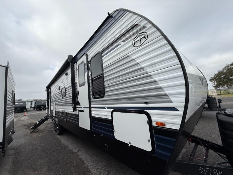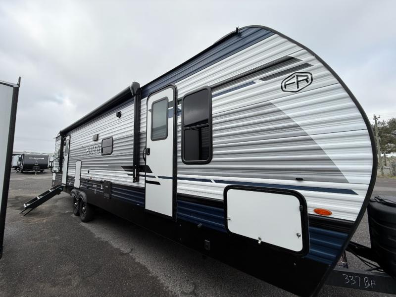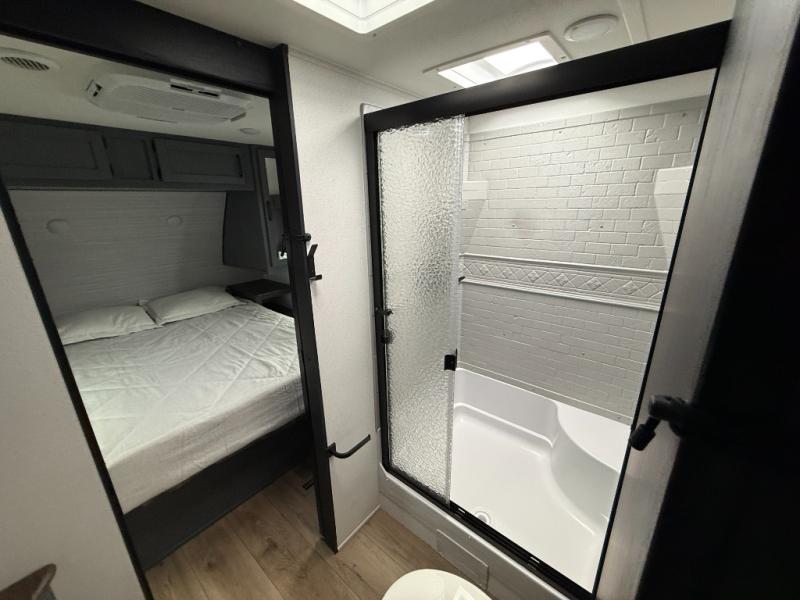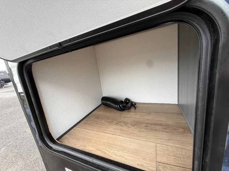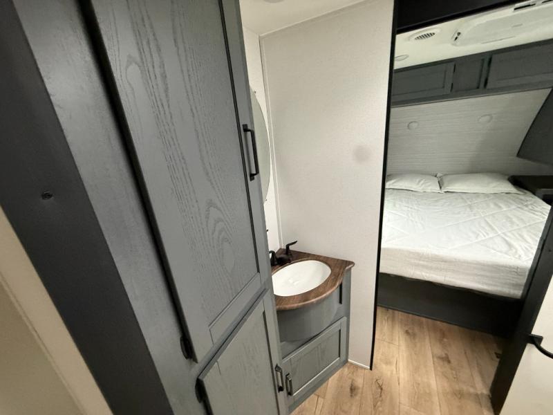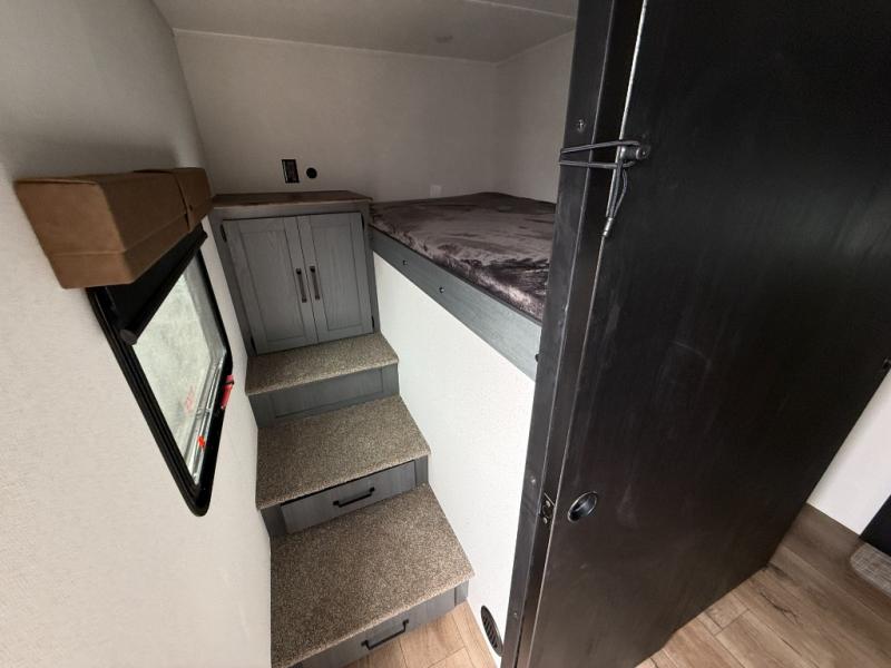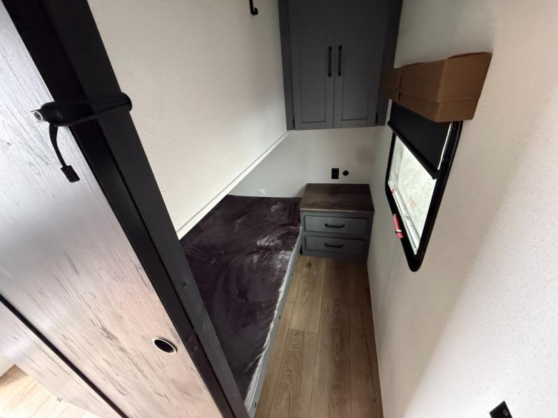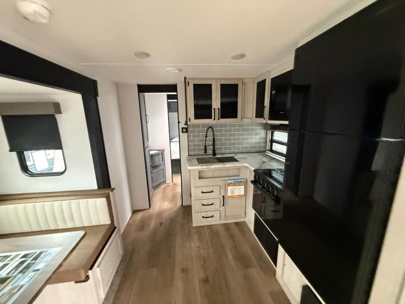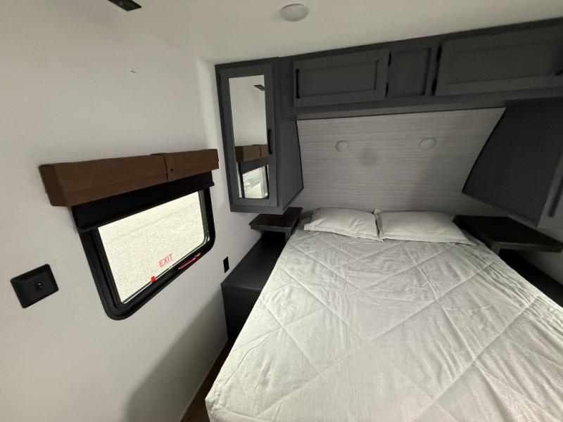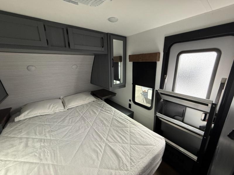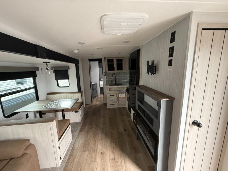 This travel trailer is perfect for camping with a larger group of friends or if you have older kids since there are two private bunkrooms! Each room includes a bunk bed and storage space for clothes, shoes, and more. You'll enjoy your own space up front in the master bedroom that includes a queen bed, dual shirt closets, and one of the dual entry doors to the unit for added convenience. Everyone can come together in the combined living area and kitchen that includes a large slide out with a sofa and booth dinette, plus there is a fireplace to make this space feel more like home. A full kitchen inside lets you create home-cooked meals each day, and you can choose to add the optional micro kitchen with a griddle for a pancake breakfast outdoors!