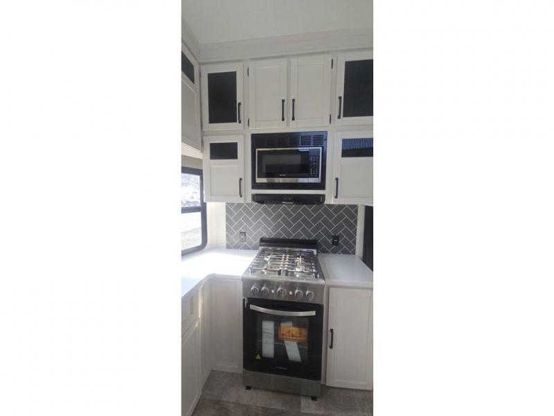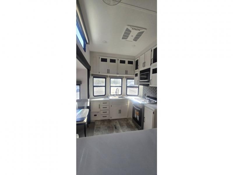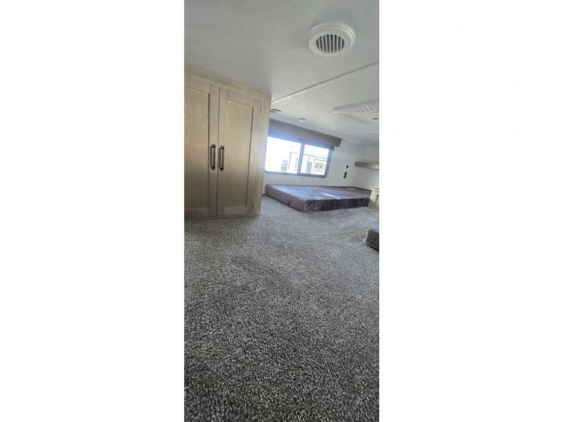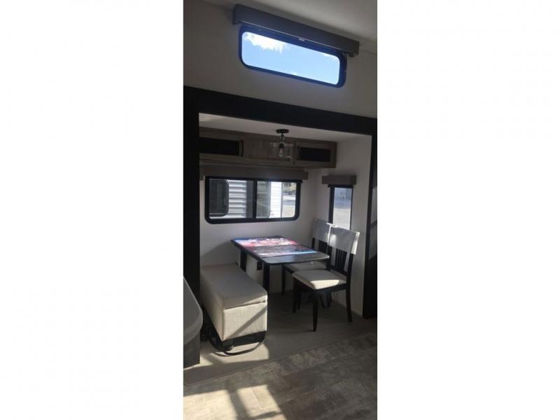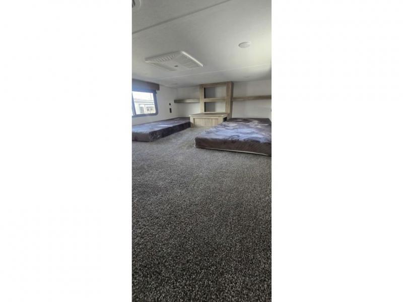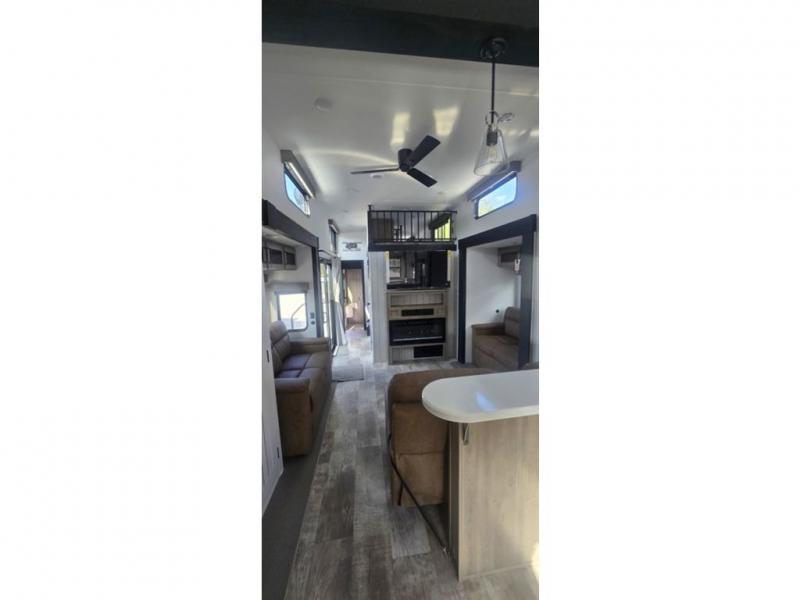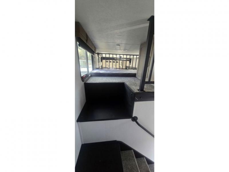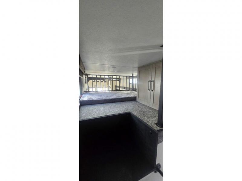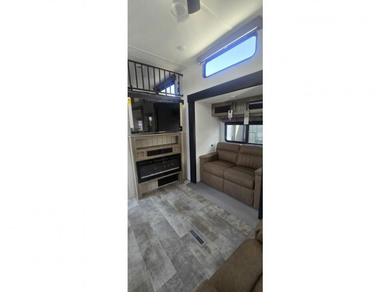 This is the perfect destination trailer for a larger group since it can sleep up to nine campers each night. The little ones will love the double loft areas with three bunk mats and storage space for their things, while you take the rear private bedroom. There is a king bed slide out here, along with a wardrobe/closet for your clothes, plus a second closet with the option to add washer and dryer prep. Everyone can meet in the middle living room to relax on the dual sofas or recliners across from the fireplace and entertainment center. Head to the front of the unit where you'll find the kitchen that includes ample counter space to prep meals, a residential style refrigerator and pantry for food storage, and a free-standing table to dine at. There is also a breakfast nook that overlooks the living area so you can visit with the cook and watch a movie at the same time!