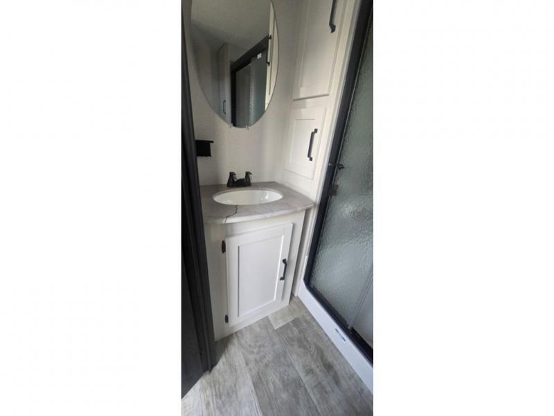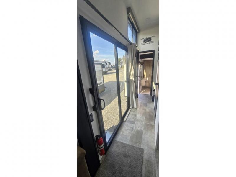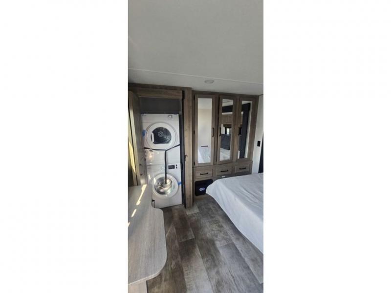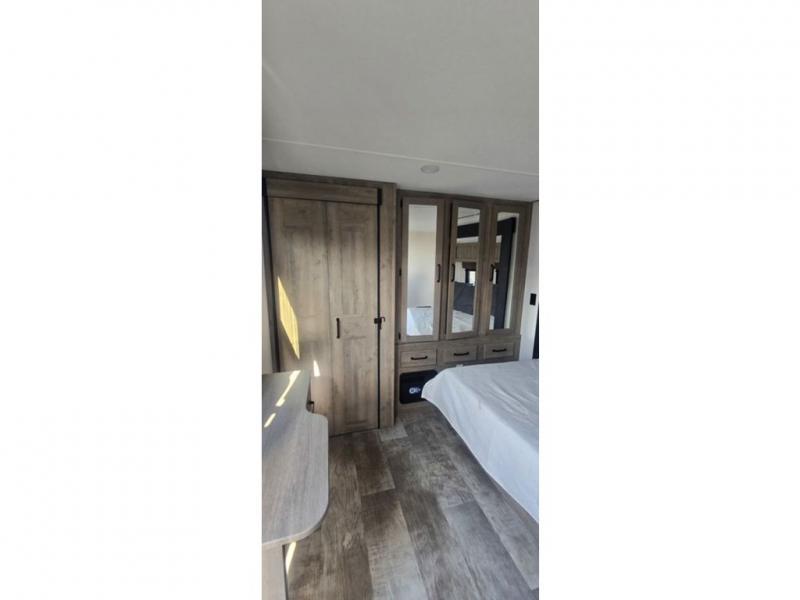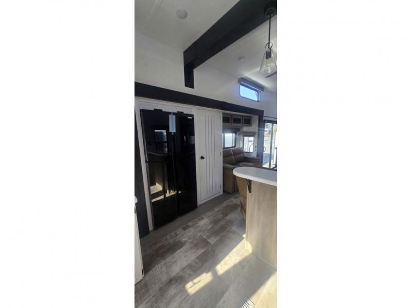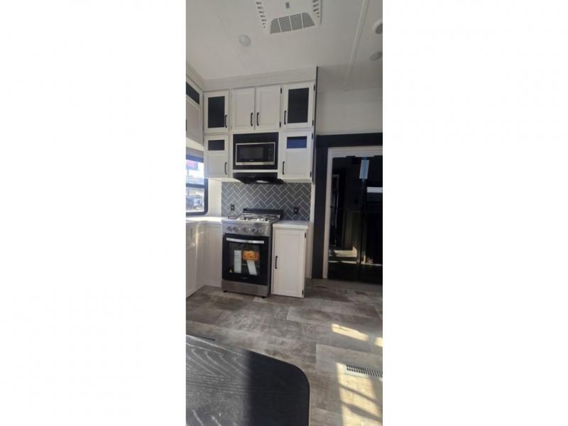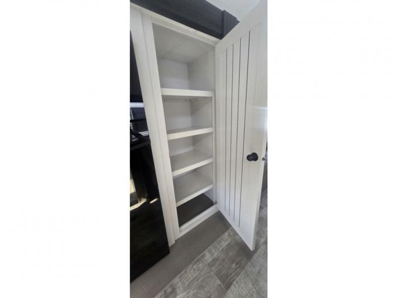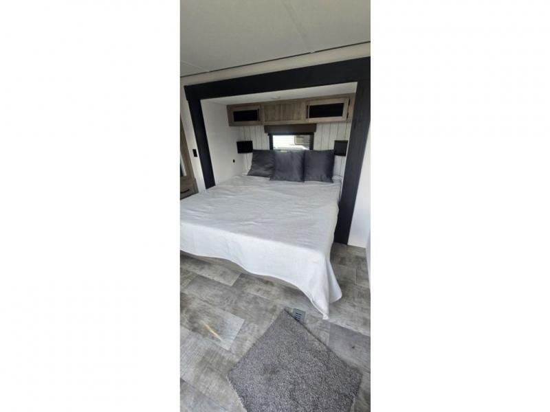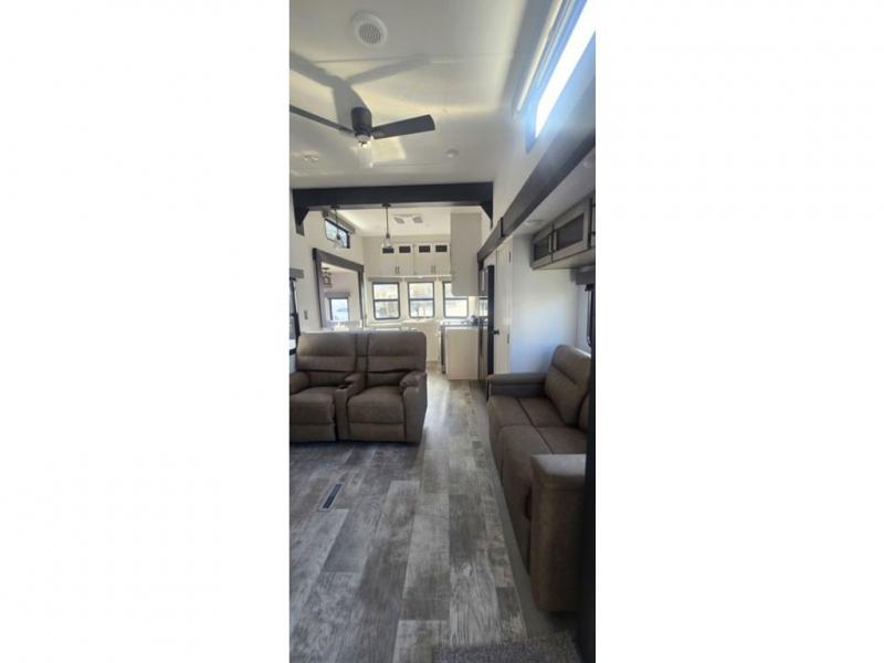 This is the perfect destination trailer for a larger group since it can sleep up to nine campers each night. The little ones will love the double loft areas with three bunk mats and storage space for their things, while you take the rear private bedroom. There is a king bed slide out here, along with a wardrobe/closet for your clothes, plus a second closet with the option to add washer and dryer prep. Everyone can meet in the middle living room to relax on the dual sofas or recliners across from the fireplace and entertainment center. Head to the front of the unit where you'll find the kitchen that includes ample counter space to prep meals, a residential style refrigerator and pantry for food storage, and a free-standing table to dine at. There is also a breakfast nook that overlooks the living area so you can visit with the cook and watch a movie at the same time!