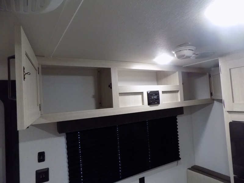 It will be so easy to enjoy camping trips in this single axle travel trailer! There is a front RV queen bed with flip-up storage at the foot of the bed for your belongings, and any additional guests can sleep on the booth dinette with an open shelf above. A full kitchen includes a stainless two burner cooktop and stainless microwave to cook meals each day, and the 4.3 cu. ft. 12V black glass refrigerator will keep your food fresh. And a private bath includes a 24" x 32" shower to clean off after a day outdoors!