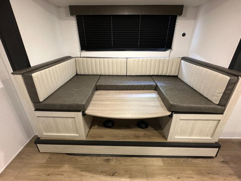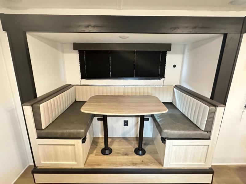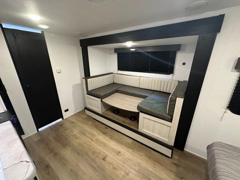 Queen bed up front, U-shaped dinette (converts), and optional Murphy bed