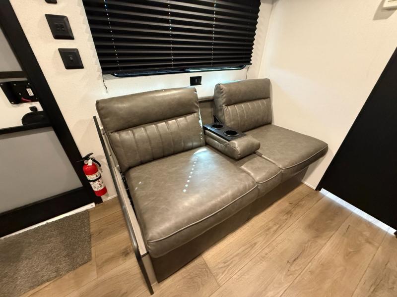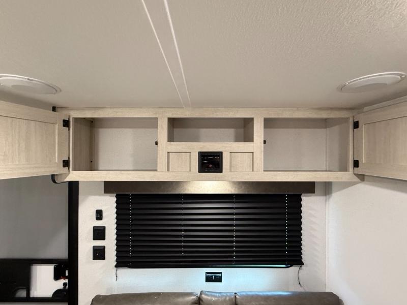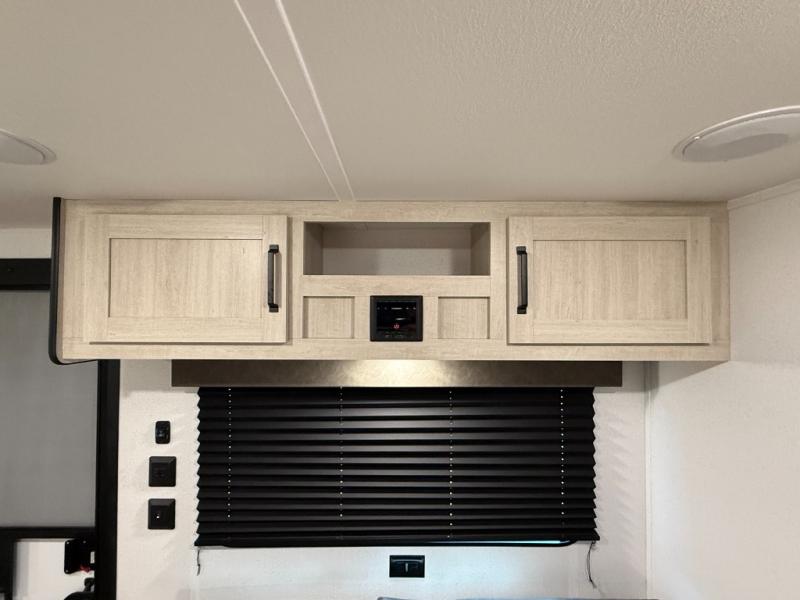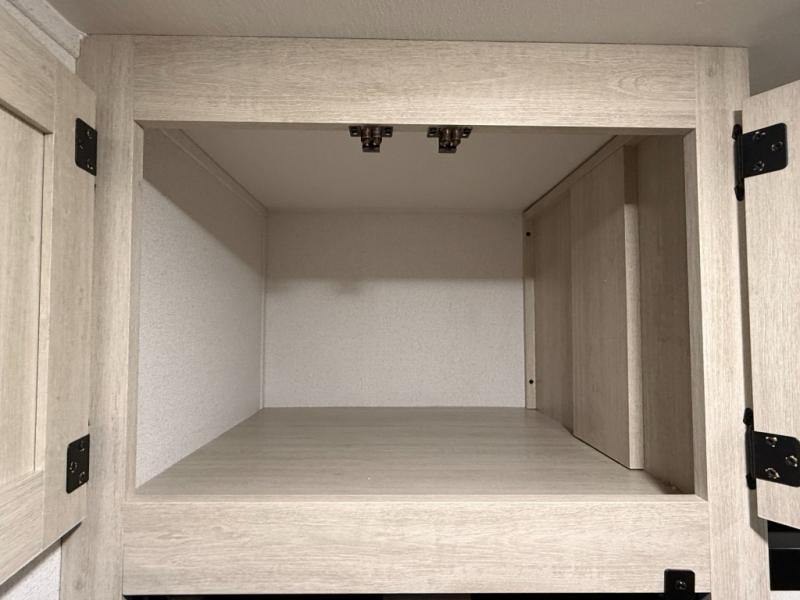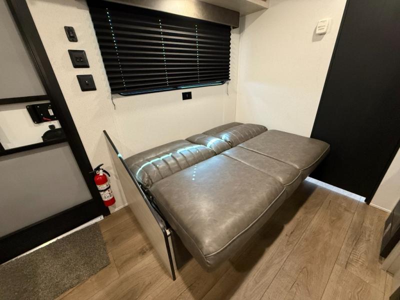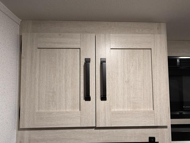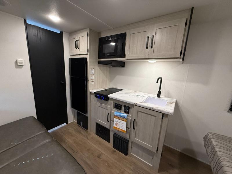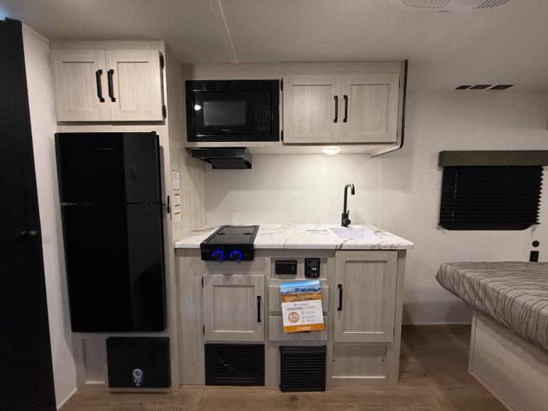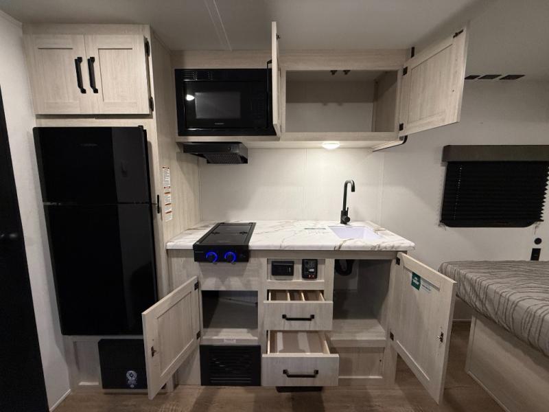 Kitchen: Equipped with a 2-burner cooktop, stainless microwave, and 4.3 cu ft 12V black glass refrigerator