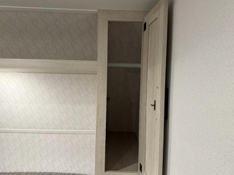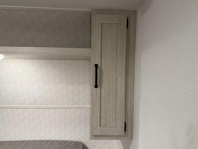 Front Bedroom: 60" x 74" RV queen bed with bedside shirt closet and overhead shelf