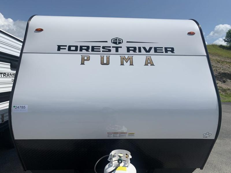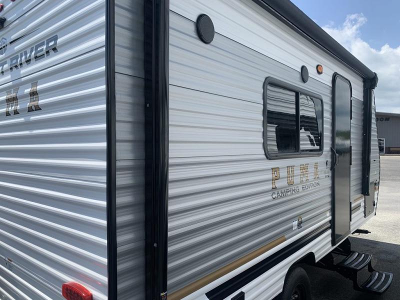 The Puma Camping Edition by Palomino offer an affordable travel trailer for rookie campers or seasoned RVers! They are built with 5/8" tongue and groove plywood flooring and a front diamond plate for added protection. There are also exterior clamp style door latches, back up camera prep, and 20 lb. LP bottles. Head inside to find Thermofoil countertops with a smooth drop edge, bedroom USB ports and outlets, and a GE appliance and kitchen package.