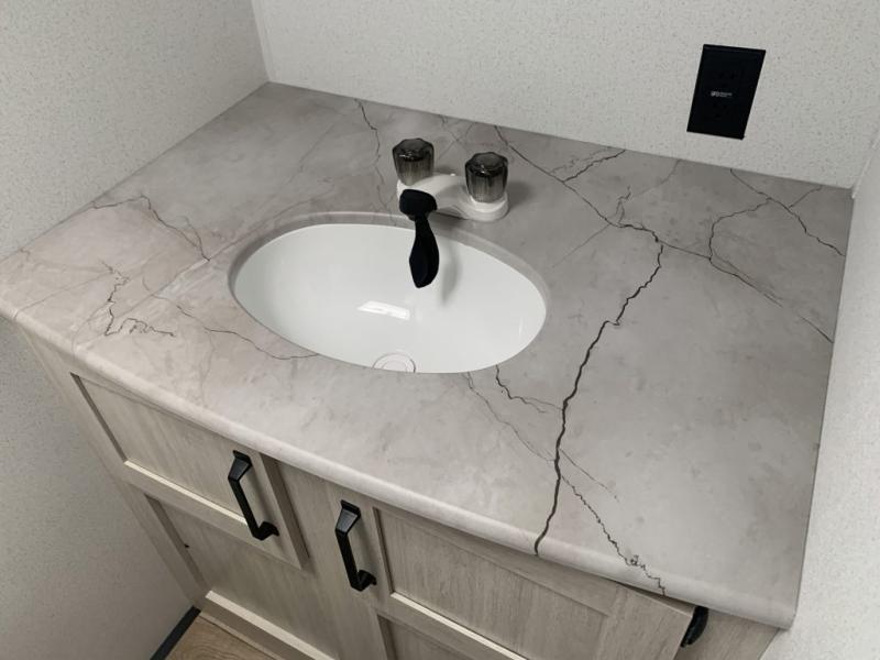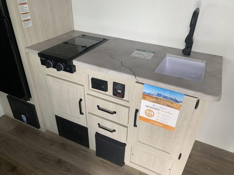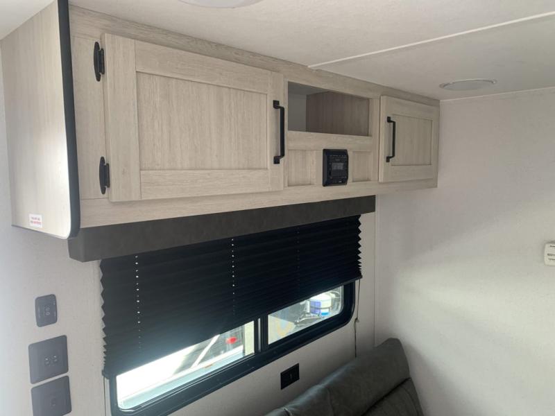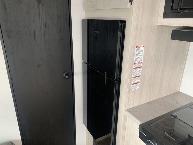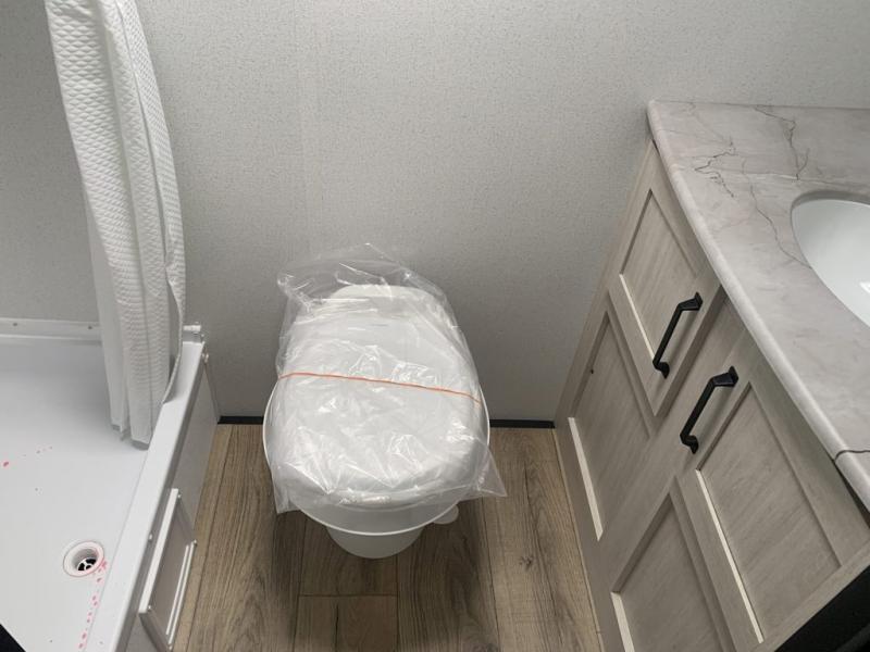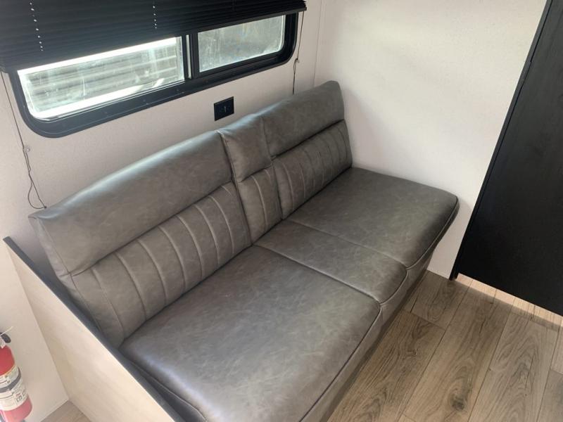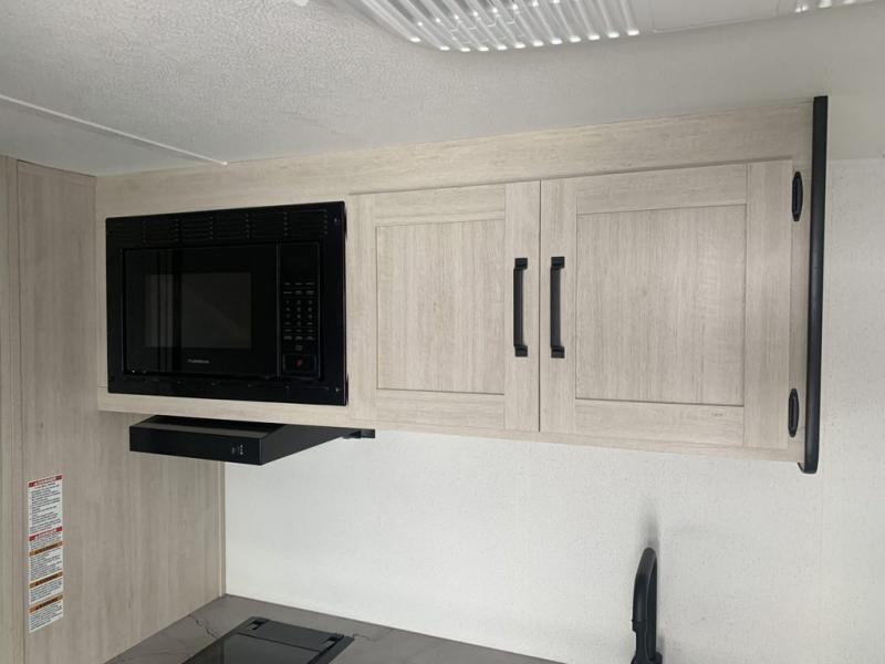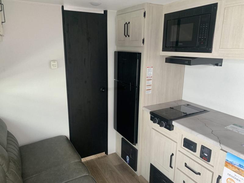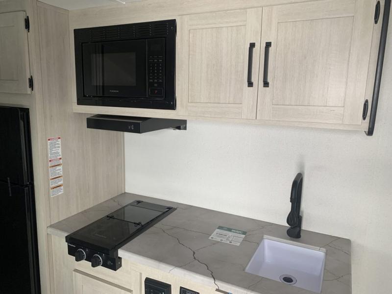 This single axle travel trailer is one you won't want to pass up! There is a front RV queen bed with a bedside shirt closet and overhead shelf for your things, and one more adult or two little ones can sleep on the booth dinette. A full kitchen includes a stainless two burner cooktop and stainless microwave to cook meals each day, and the 4.3 cu. ft. 12V black glass refrigerator will keep your food fresh. This model also includes a full rear bath with a toilet, sink, and 36" x 30" shower for easy cleaning up!