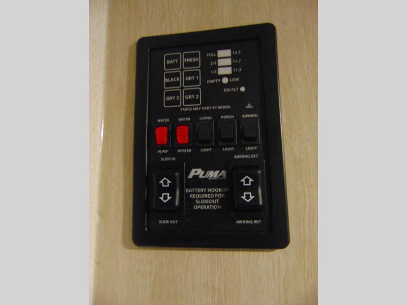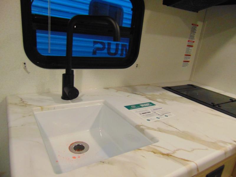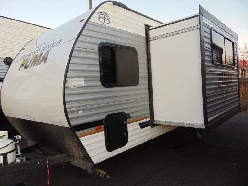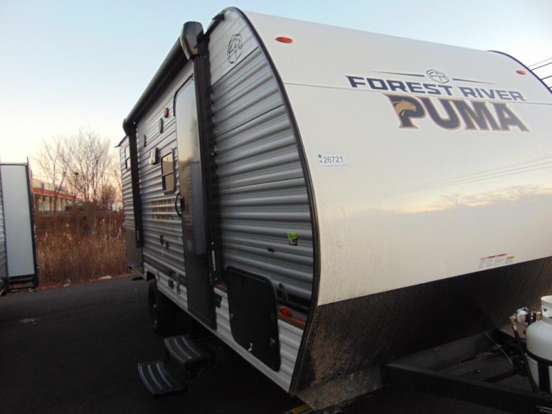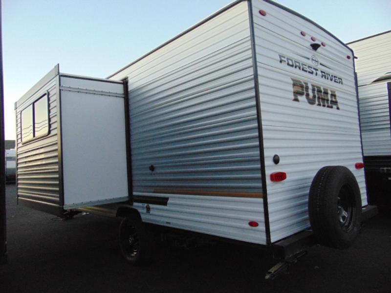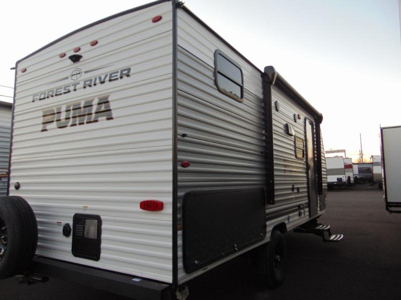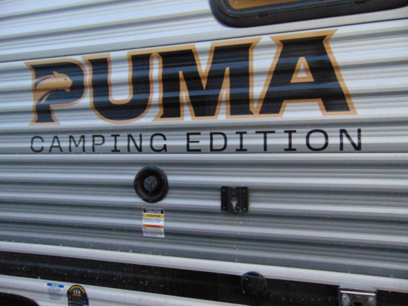 The Puma Camping Edition by Palomino offer an affordable travel trailer for rookie campers or seasoned RVers! They are built with 5/8" tongue and groove plywood flooring and a front diamond plate for added protection. There are also exterior clamp style door latches, back up camera prep, and 20 lb. LP bottles. Head inside to find Thermofoil countertops with a smooth drop edge, bedroom USB ports and outlets, and a GE appliance and kitchen package.